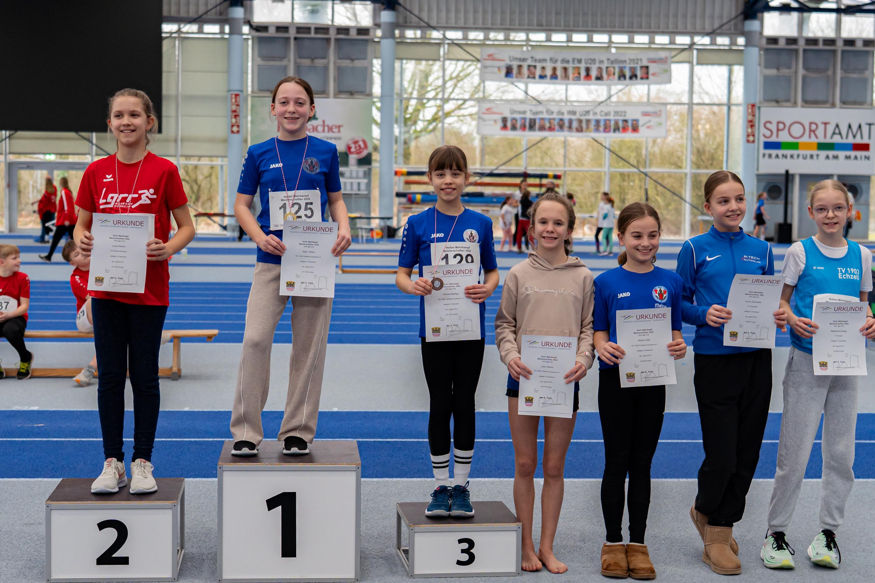 Die knappste Entscheidung gab es im Vierkampf der W12 zwischen Franziska Frank vom TV Nieder-Weisel und Greta Behr vom TSV Friedberg-Fauerbach. Nur zwölf Punkte trennten beide Athletinnen. Während Behr, im vergangenen Jahr Kreismeisterin der W11 im Hallen-Dreikampf, herausragende 1,40 Meter hoch sprang, war Frank in den weiteren drei Disziplinen jeweils besser und knackte im Weitsprung die Vier-Meter-Marke (4,03 m).
