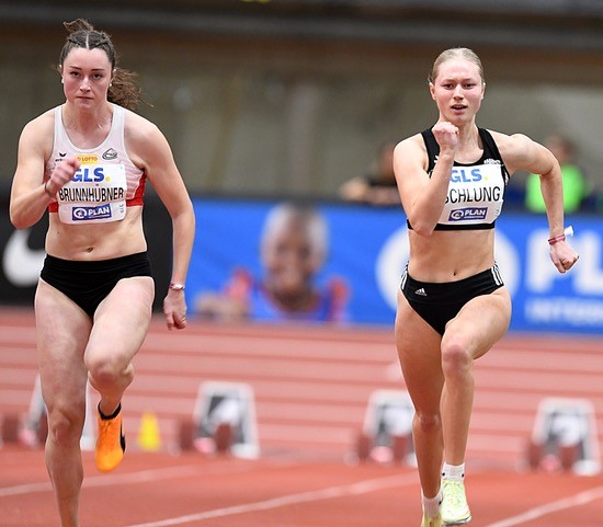 60 Meter: Hier gab es das erwarte Edelmetall. Lisa Mayer (Sprintteam Wetzlar) wurde in starken 7,21 Vizemeisterin, blieb nur um 0,01 Sekunden über ihrer Saisonbestmarke und musste lediglich ihrer Nationalteam-Kollegin Gina Lückenkemper (SCC Berlin/7,17 sec.) den Vortritt lassen. Lisa gewann mit 7,38 Sekunden ihren Vorlauf und steigerte sich im Halbfinale auf 7,26 Sekunden. Die Form für die Hallen-EM in Istanbul stimmt also. Antonia Dellert (ebenfalls Sprintteam Wetzlar) belegte nach 7,38 Sekunden den fünften Platz. Ein toller Erfolg für die jüngste Athletin (U23) im Feld, die in den beiden ersten Runden jeweils 7,41 Sekunden zeigte.