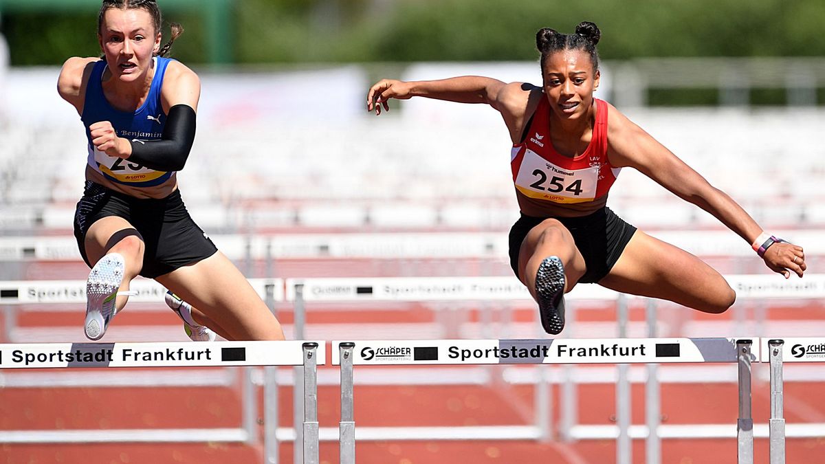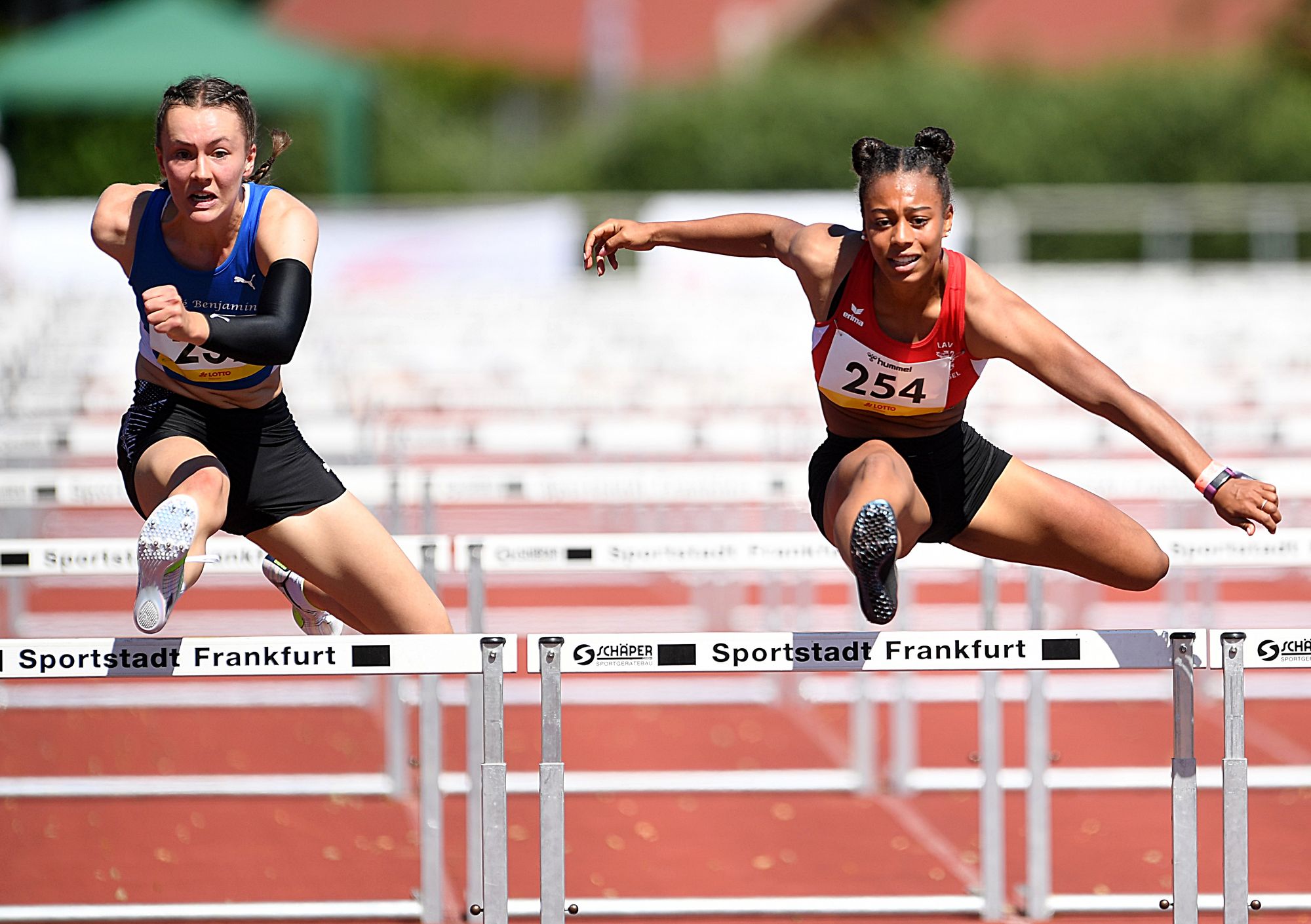 100 Meter Hürden: Die Kurzhürden endeten mit einem hessischen Doppelsieg. Laura Carilus (LAV Kassel) setzte sich mit 14,27 Sekunden durch, wurde bei ihrem Sieg aber von Jenna Fee Feyerabend arg bedrängt. Die Siebenkämpferin (noch U20) drückte als Zweite ihren „Hausrekord“ auf 14,32 Sekunden und nimmt an diesem Wochenende in Wesel die Mehrkampf-DM in Angriff. Lilian Tösmann (Eintracht Ffm.) verzichtete nach 14,87 Sekunden in der ersten Runde aufs Finale. Gleiches trifft auf Carolin von Sommerfeld (TV Haiger/15,62 sec.) zu. Lilly Müller (LAV Kassel) schrammte als Vierte (14,82 sec.) knapp an Edelmetall vorbei. Juliana Kratz (TV Gelnhausen/U20) wurde mit 15,76 Sekunden (7.) gestoppt.