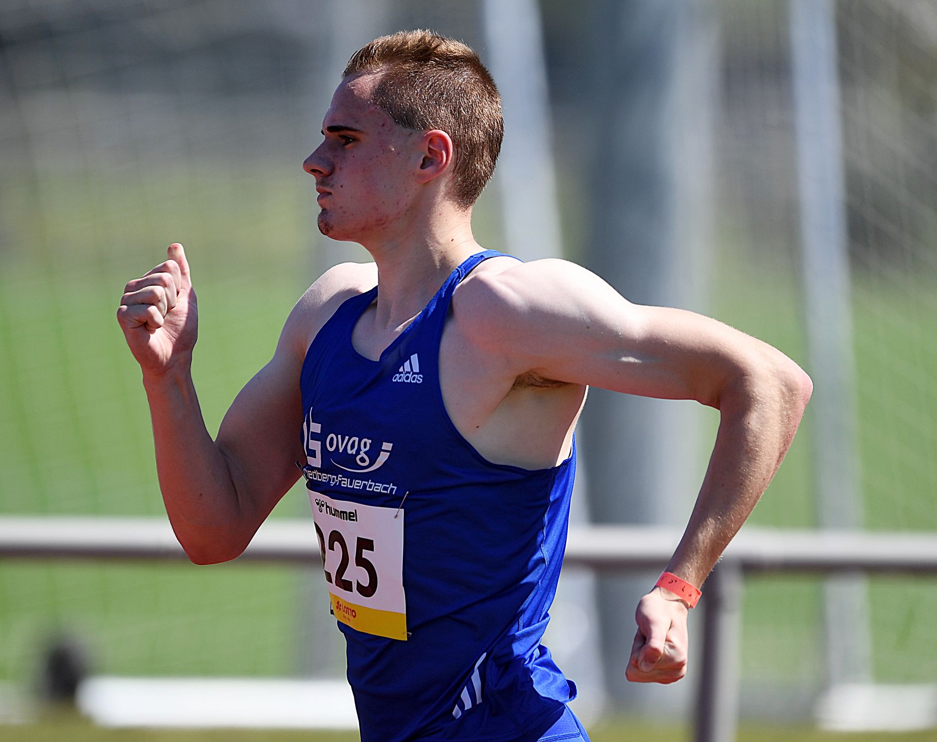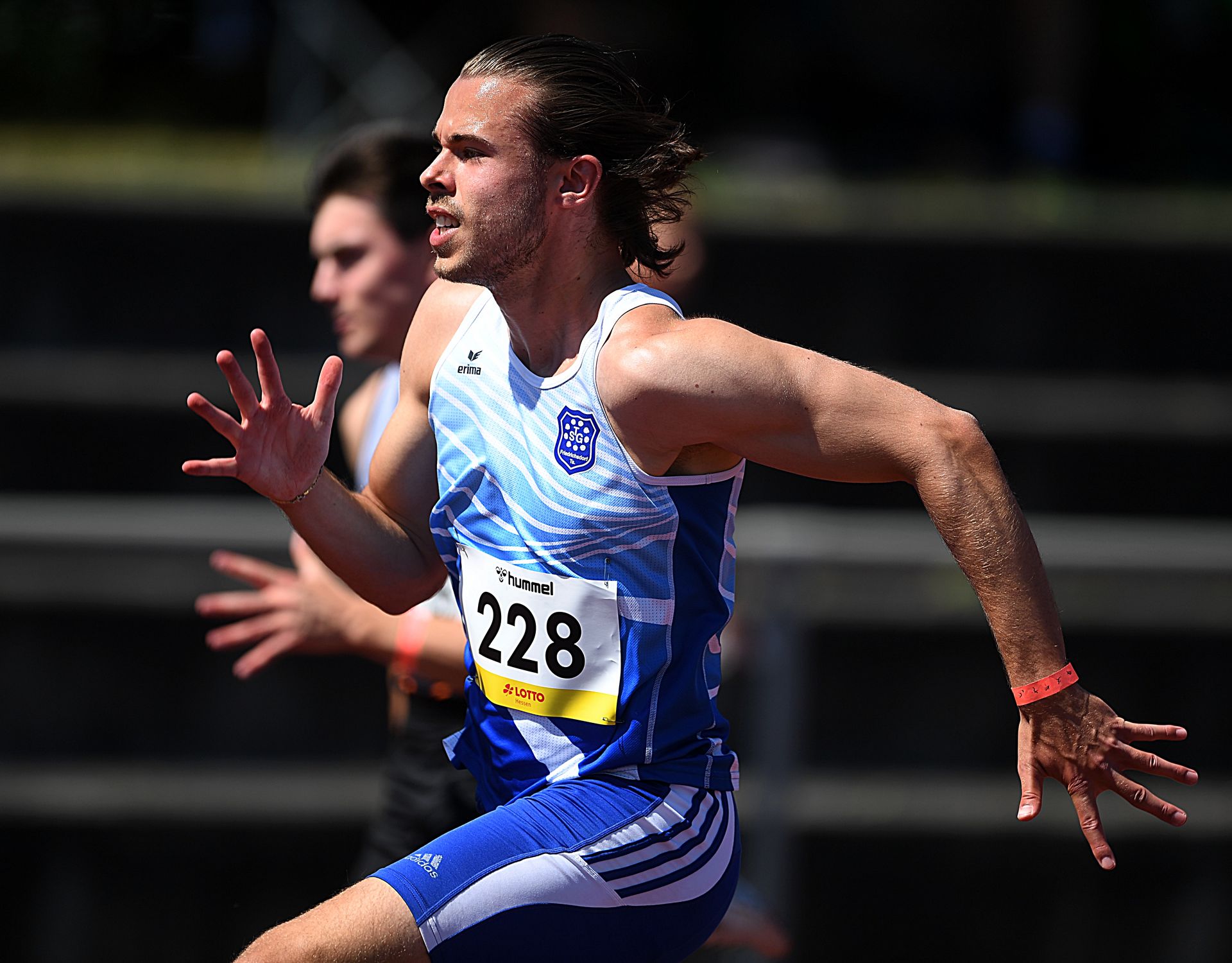 100 Meter: Mit gleich fünf Hessen hatte das 100-Meter-Finale eher den Touch einer „HM“. Aus lediglich zwei Vorläufen wurden die Finalisten ermittelt. Tim Kolbe (TSG Friedrichsdorf) zeigte in der ersten Runde an, dass er den Titel haben will. Mit 10,96 Sekunden blieb er als einziger der vierzehn Starter unter elf Sekunden. Im Finale musste der Favorit dann kurz zittern - Fehlstart! Ein Kampfrichter wollte erst Kolbe disqualifizieren. Doch es war der Nebenmann, der zuckte und so den zu frühen Start provozierte. Nach einer gelben Karte durften alle Sprinter erneut in den Block gehen. Der TSG-Athlet kam prima aus dem Block, beschleunigte optimal und lief seinen Konkurrenten davon. Mit 10,70 Sekunden stellte der Youngster aus der Zwiebackstadt eine neue „PB“ auf und hat in seinem ersten U23-Jahr im hessischen Männer-Ranking lediglich vier Sprinter vor sich. Linus Krüger (SV Fun-Ball Dortelweil) wurde mit 11,08 Sekunden Dritter. Dahinter sortierten sich Dorislav Stratulat (SV Fun-Ball Dortelweil/5. mit 11,21 sec.), Daniel Borchardt (Eintracht Frankfurt/6 in 11,29 sec.) sowie Felix Flick (TV Wetzlar/7. mit 11,32 sec.) ein. Im VL: Philip Stahl (LG Dornburg/11,49 sec.), Maxim Meinhardt (Wiesbadener LV/11,55 sec.), Steffen Graffe (ASC Darmstadt/11,56 sec.).