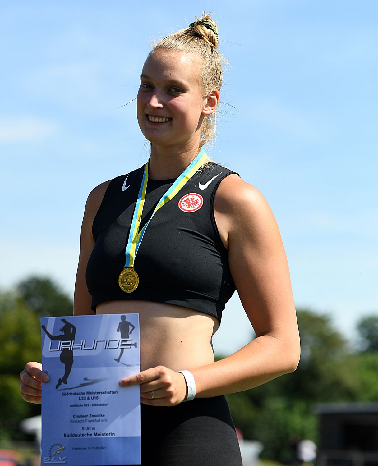Diskuswerfen: Erst mit ihrem letzten Wurf auf 51,51 Meter machte Charleen Zoschke den Titel klar. Die Eintrachtlerin hatte zuvor „nur“ 48,29 Meter auf der Habenseite. Das hätte nicht gereicht, denn Hanna Kaiser (LG Bernkastel-Wittlich) war bis dahin mit 48,82 Metern etwas besser unterwegs. In ihrer Paradedisziplin klappte es für Katja Seng (LAZ Bruchköbel/U20) mit einem Wurf auf 45,64 Meter mit der Bronze-Medaille.