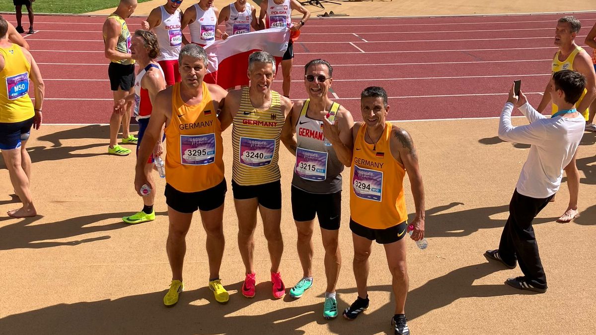 - Sonntag, 13:00 Uhr, 4x400m, die Erwartungen nicht sehr hoch, in der Staffel neben Nils ein 1.500m-Läufer der Altersklasse M50 sowie 2 Läufer die der Altersklasse M55 bzw. M60 angehören. Dann das Rennen, und die Überraschung, die Zeit für die Vier saustark, für die Vier ein megagutes Rennen in 4:09,30min, Platz 7.