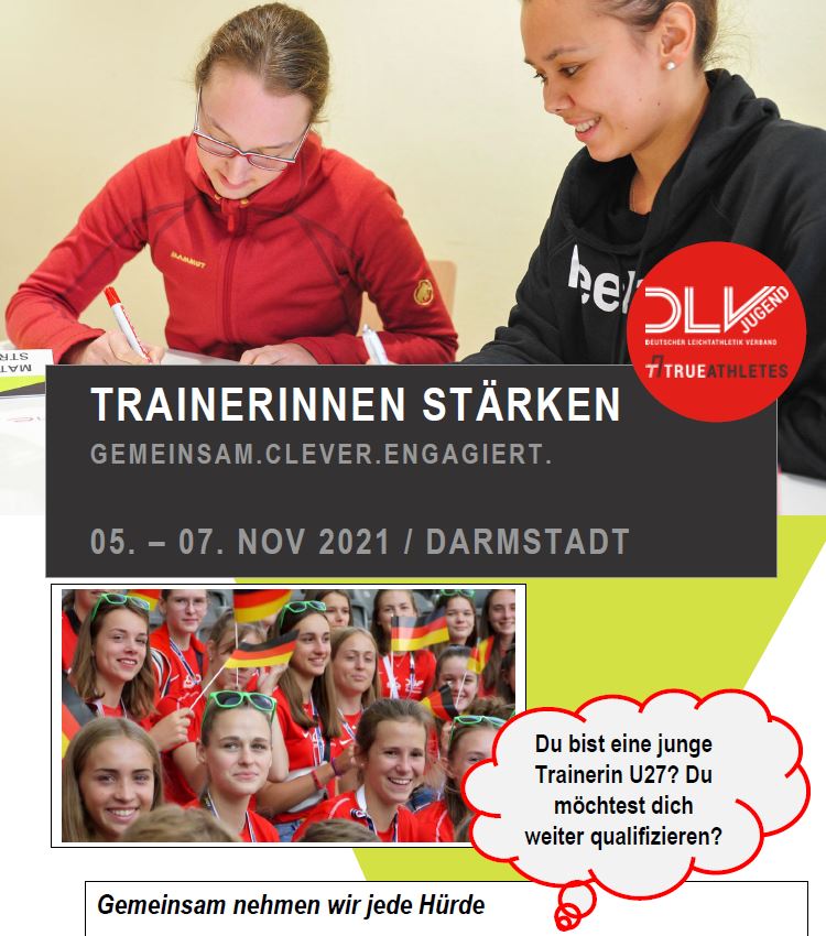 Der Deutsche Leichtathletik Verband bietet im Rahmen seiner Bildungsangebote das Seminar „Trainerinnen stärken“ vom 05. bis 07. November 2021 in Darmstadt an. Es richtet sich an Trainerinnen im Alter zwischen 18 und 26 Jahren, die bereits im Besitz einer Trainerlizenz sind.