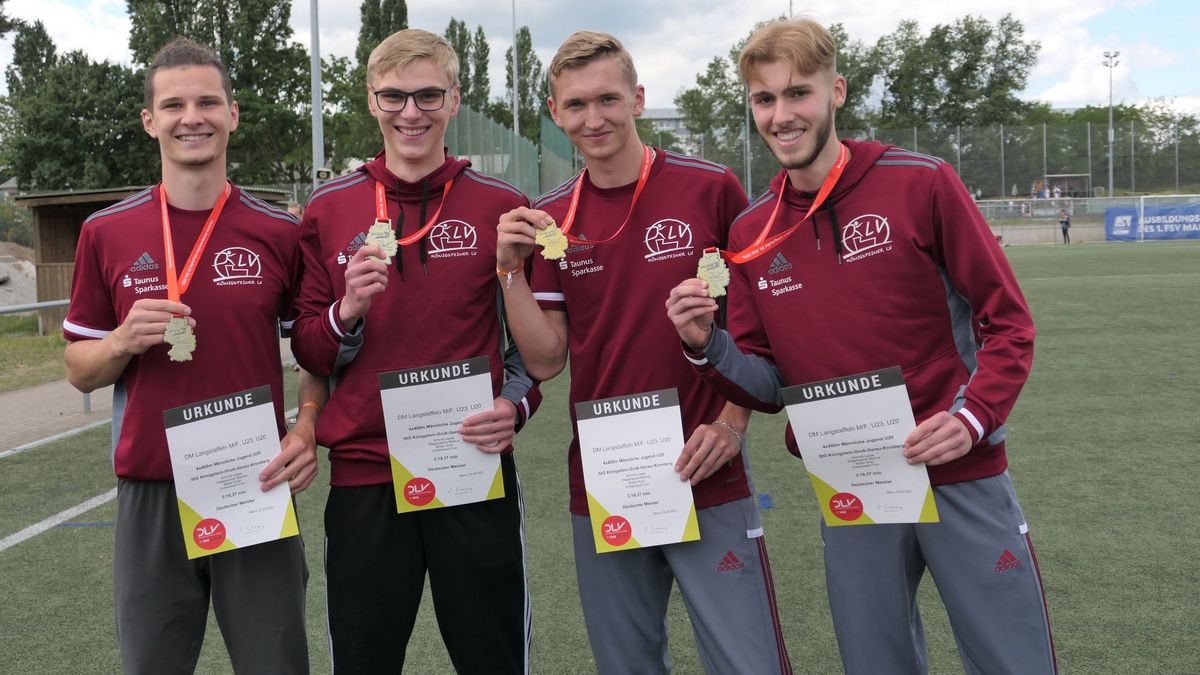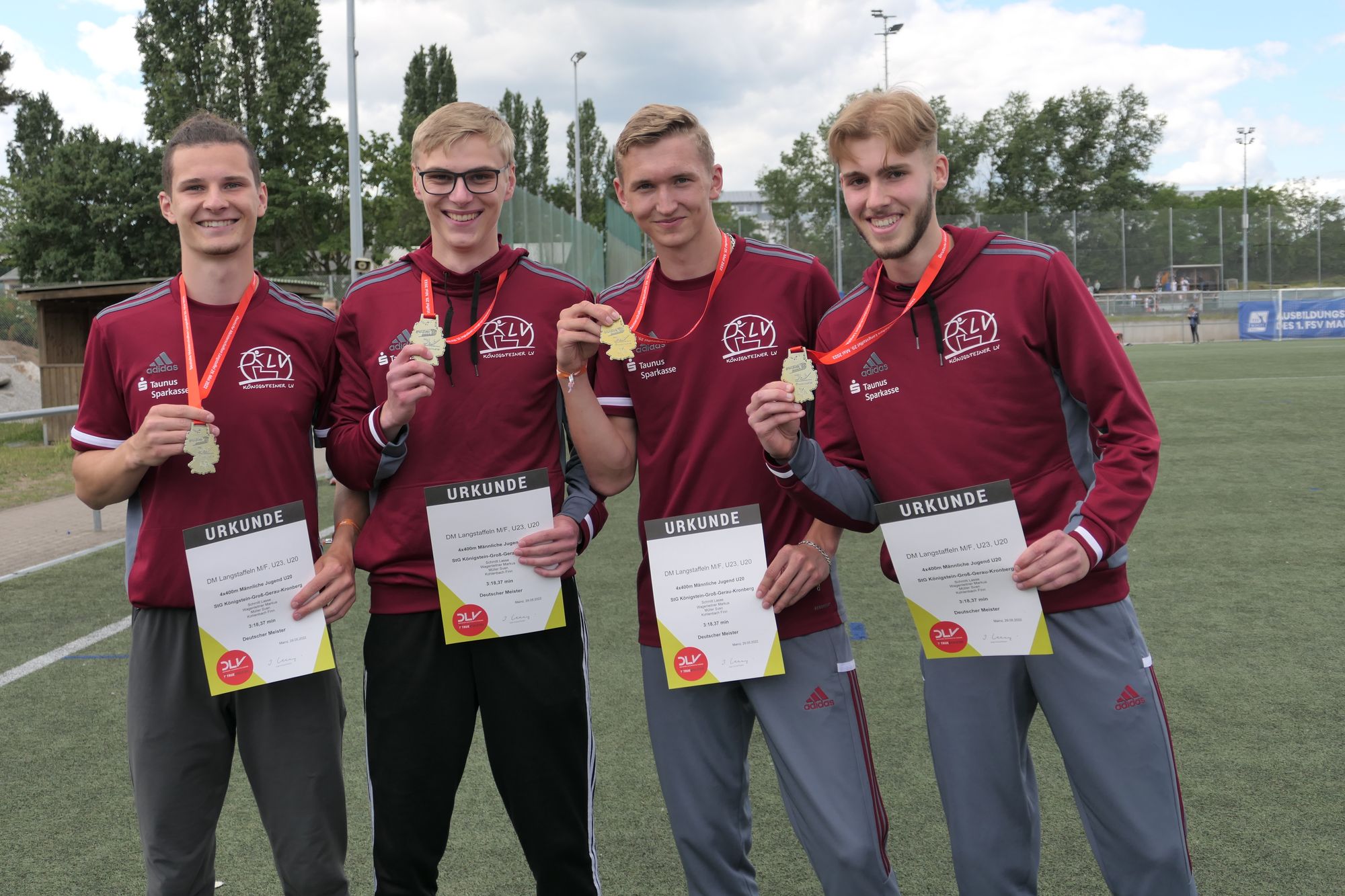 Der zweite Titel ging in der Altersklasse U20 an die Jungs der Startgemeinschaft „Königstein - Groß Gerau - Kronberg“. Über die 4x400 Meter galt die LG Nord Berlin als Favorit, doch auf dem Tartanbelag mussten sich die Hauptstädter den schnellen hessischen Langsprintern geschlagen geben. Auch hier war das Rennen nichts für schwache Nerven, denn nach den vier Runden entschieden gerade einmal 0,09 Sekunden über den begehrten DM-Titel. Und der ging in die erweiterte Taunus-Region. Lasse Schmitt, Markus Wagenleitner (beide Königsteiner LV), Sven Müller (MTV Kronberg) und Finn Kohlenbach (KLV) zeigten mit hervorragenden 3:18,37 Minuten eine absolute Top-Leistung und viel Kampfgeist. Besonders bemerkenswert war, dass die Truppe in Mainz leider nicht in Bestbesetzung an den Start gehen konnten. Top-Mann Okai Charles (KLV) ist nach seiner Verletzung noch immer nicht ganz fit und konnte deshalb nicht eingesetzt werden. Für ihn sprang Markus Wagenleitner (ebenfalls KLV) in die Bresche, der aber noch einen harten Zehnkampf vom Wochenende zuvor in den Beinen hatte, sich aber selbstverständlich in den Dienst der Mannschaft stellte.