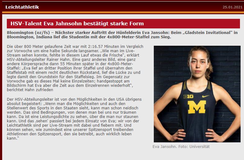 Gelaufen ist Eva in der „Harry Gladstein Fieldhouse – Leichtathletikhalle in Bloomington. Wenn man die Möglichkeiten und auch den Stellenwert des Sports in den Staaten sieht kann man schon neidisch werden. Das sind Bedingungen von denen man bei uns nur träumen kann. Da ist eine Leistungsdichte zu sehen über die man nur staunen kann.