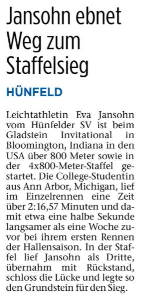 Gladstein Invitational, Bloomington, Indiana; Eva Jansohn bestätigt ihre Leistung vom vergangenen Wochenende