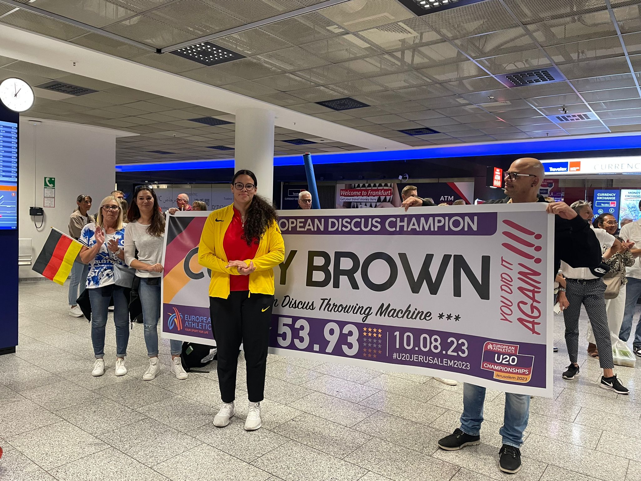 Die neue Marke schockte wohl die gesamte Konkurrenz, denn keine Gegnerin konnte Wepiwe bis zum fünften Durchgang von der Spitze verdrängen. Die größte Gefahr kam aus dem deutschen Lager. Lea Bork (LV 90 Erzgebirge) erzielte zum Auftakt 53,14 Meter und packte mit 53,46 m noch etwas drauf. Curly Brown (Eintracht Frankfurt), die dritte deutsche Finalistin, lag bis dahin trotz guter 52,35 Meter außerhalb der Medaillenränge. Der letzte Versuch der Adlerträgerin war dann aber der „goldene Wurf“. Der ein Kilogramm schwere Diskus flog auf überragende 53,93 Meter. Brown (noch U18) löschte damit auch Wepiwes Hessenrekord und holte sich den Titel. Für Brown war es bereits das zweite EM-Gold, nachdem sie im Vorjahr an gleicher Stelle auch schon bei den kontinentalen Titelkämpfen der U18 erfolgreich war.