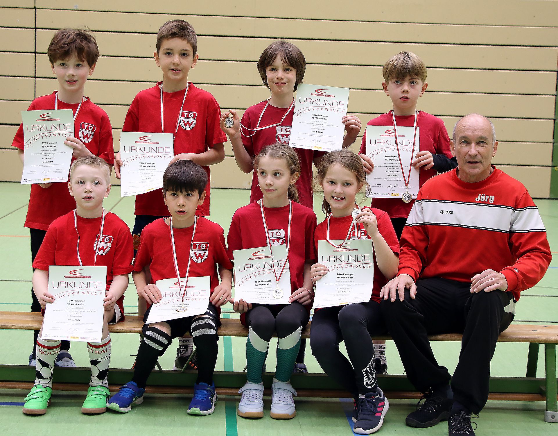 So standen Sprints, Hindernisse, Medizinballstoßen sowie Ziel-Weitsprung auf dem Programm. Am besten haben die Flamingos der TG Wehlheiden unter Übungsleiter Jörg Werner, der selbst eine 5000-Meter-Bestzeit von 14:48,8 Minuten vorzuweisen hat, unter zehn Formationen der U 10 die neuen Bewegungsabläufe eingeübt und absolvierten unter den Applaus vieler Vatis und Muttis vor den KSV-Runner aus Baunatal sowie den Panther des SSC Vellmar am erfolgreichsten das neue Programm. In der U 8 teilten sich die Löwen des SSC Vellmar sowie die Minis des LAV Kassel den Sieg.