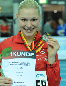“Heute habe ich mich und meinen Trainer am meisten überrascht.“ Das waren Lisa Mayers erste Worte zu ihren zwei Läufen über 200 Meter. Bestleistung im Vorlauf in 23,61 Sekunden, Bestleistung im Finale (23,30) – beide Male steigerte Lisa Mayer ihren eigenen Hessenrekord aus dem Vorjahr (23,66). Nur Rebekka Haase (LV 90 Erzgebirge/23,10) war bei ihrem Titel-Hattrick auf dieser Strecke noch schneller. Mit diesen Zeiten steigen Lisa Mayers Ansprüche. Im Sommer will sie zu den Europameisterschaften (6. bis 10. Juli) und über die halbe Stadionrunde eine „tiefe 23er-Zeit“ laufen. Der Deutsche Leichtathletik-Verband (DLV) fordert für Amsterdam als Qualifikationsleistung 23,20 Sekunden. Und dann gibt es da noch die Olympischen Spiele in Rio und als Motivation die 4x100 Meter-Staffel. „Mal schauen, was da geht. Die Konkurrenz im deutschen Frauensprint ist aber gerade enorm.“