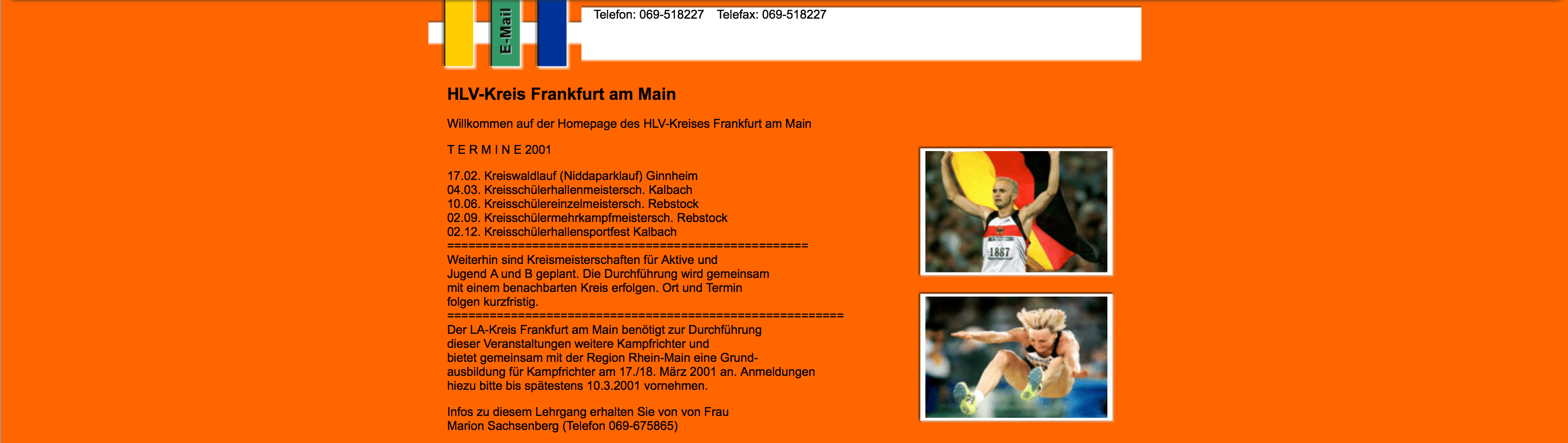Vielen Dank an Christian Kany, Webmaster des Leichtathletikkreises Frankfurt am Main und den Mitarbeitern der Geschäftsstelle des Landesverbands, die in vielen Arbeitsstunden die neue Homepage gestaltet haben.