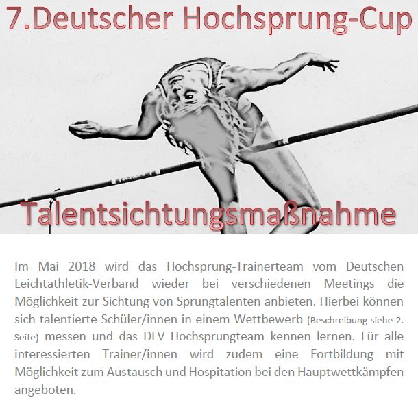 Darüber hinaus wird wieder der Nachwuchs eingebunden - in Kooperation mit dem Deutschen Leichtathletik-Verband (DLV) ist in Hattersheim zum wiederholten Male der Deutsche Hochsprung-Cup ausgeschrieben. Zu diesem Sichtungswettkampf sind alle talentierten Schüler/innen der Altersklassen U14/16 eingeladen. Wie bei den anderen Cup-Veranstaltungen, darf sich Sieger nennen, wer in der Höhenaddition der besten Einzelergebnisse von beiden Seiten die größte Sprunghöhe vorweisen kann. Belohnt werden die Gewinner mit Eintrittskarten für das 40. Internationale Hochsprung-Meeting in Eberstadt (24. bis 26. August).
