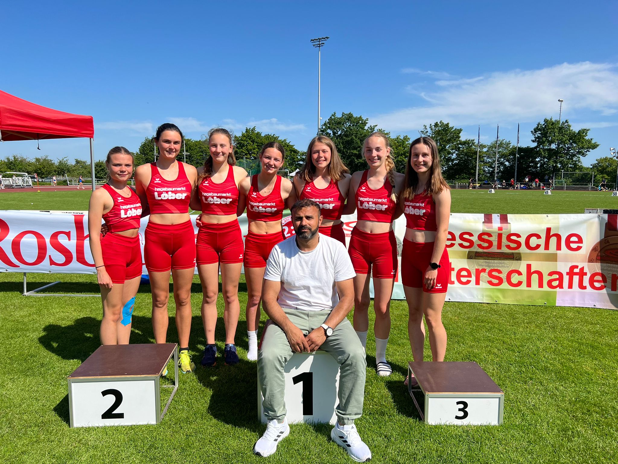 Mit einer Steigerung ihrer persönlichen Bestmarke um fast neun (!) Meter gewann Stine Hennemann den Hessischen Meistertitel im Speerwurf der weiblichen Jugend W14. Gleich im ersten Versuch hatte sie mit einem Wurf auf 28,05 Meter ihre alte Bestweite pulverisiert und die Führung übernommen. Im zweiten Durchgang konterte Lisa Becker mit 29,07 Metern und im dritten Versuch zog auch Greta Wiegand mit 29,32 Metern vorbei. Hennemann aber hatte ihr Pulver noch nicht verschossen, setzte sich mit einem Wurf auf die neue Kreisrekordweite von 30,26 Metern wieder an die Spitze und holte ihren ersten Meisterwimpel auf Landesebene. „Wir haben in den letzten Wochen intensiv an der Wurftechnik gefeilt, das hat Stine heute perfekt umgesetzt“, erklärte Trainer Mustafa Hallal die Leistungsexplosion seines Schützlings.