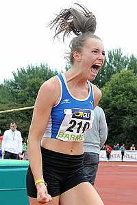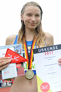Zeitgleich mit Jenna Fee Feyerabend (TV Groß-Gerau) wurde Sarah in 11,72 sec. erst auf Rang drei geführt. Nachdem das Kampfgericht dann die dritte Stelle hinter dem Komma ausgewertet hatte, lautete die Reihenfolge dann Feyerabend mit 11,72 sec. auf dem Bronzerang und Vogel (ebenfalls 11,72 sec.) auf dem undankbaren vierten Platz. Wahrlich keine Entscheidung im Sinne „pro Athlet“. Unglücklich war auch Antonia Unger (LG Wetzlar), die dritte Hessin im Hürdenfinale, die als Sechste (11,80 sec.) unter ihren Möglichkeiten blieb. Jenna Fee Feyerabend eilte direkt vom Hürdenfinale zum Hochsprung. Sie stieg hier bei 1,57 m in den Wettkampf ein und nahm die drei folgenden Höhen alle im ersten Versuch. Die 1,71 m waren im dritten Anlauf bezwungen, die 1,74 m gleich wieder auf Anhieb. Nachdem Rivalin Neele Schütte (RSV Eintracht Stahnsdorf) bei 1,76 m scheiterte und Jenna Fee diese Höhe meisterte, war der DM-Titel eingetütet. Die Mehrkämpferin flog dann noch bei 1,78 m über die Latte und ließ schließlich 1.80 m auflegen. Unter großem Jubel packte Feyerabend auch diese Höhe und stellte damit ihre „PB“ aus dem Jahr 2016 ein. Damit führt die Hessin die DLV-Liste in ihrer Klasse an und teilt sich in der älteren U18 zusammen mit Bianca Stichling (TSG Weinheim) die Top-Position. Grund zum Jubeln hatte beim Hammerwerfen auch Jette Priedemuth (Königsteiner LV). Die süddeutsche Meisterin von Ingolstadt markierte im zweiten Durchgang mit 45,87 m eine neue Bestmarke und holte damit die Bronzemedaille.