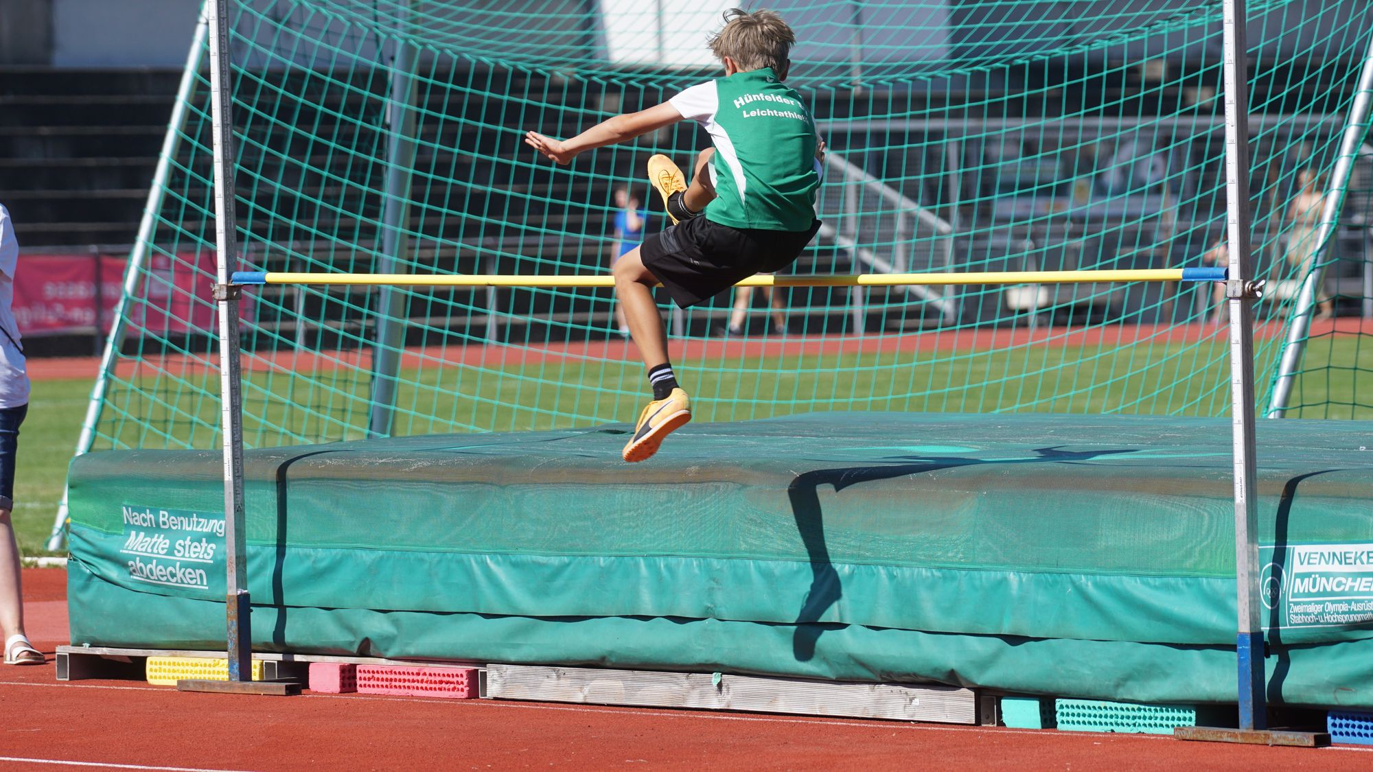 Bei den Jungs waren die Vorzeichen etwas anders gesetzt. Die Jungs der Startgemeinschaft „Hünfeld-Petersberg“ hatten sich mit der sechstbesten Punktzahl (5.249) für das Hessenfinale der 10 besten Mannschaften qualifiziert. Und während bei den Mädchen alle Athletinnen zur Verfügung standen – da war sogar ganz kurzfristig extra eine Taufe verschoben worden – gab es bei den Jungs mit der Personalisierung Probleme; für zwei Jungs war das Thema „Hessenfinale“ und die Mannschaft nicht so wichtig. Nicht schön für den Rest der Jungs und auch die Trainer, die fühlten sich schon etwas im Stich gelassen, aber man kann ja niemanden zwingen. Eine Lösung musste gefunden, die Mannschaft musste umgebaut werden. Die Lösung waren 3 Jungs von der U12 des Hünfelder SV die Hochstarten durften / mussten. Durch diesen Umbau bedingt hatten wir ein sehr junges Team, dass sich aber bravourös geschlagen hat.
