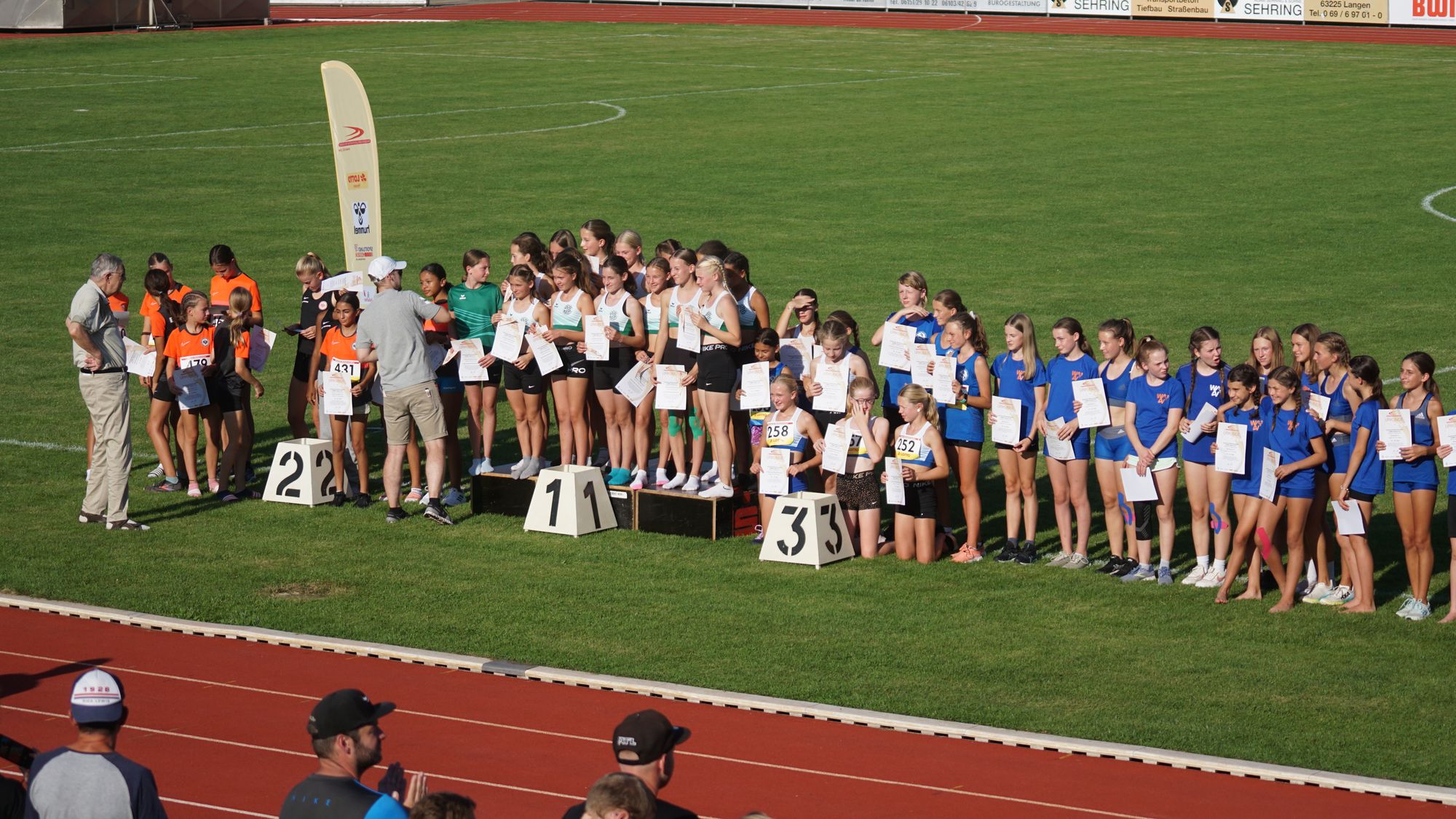Die Geschichte des Wettkampfs ist recht schnell erzählt, nach der ersten Disziplin lag die „Eintracht Frankfurt“ auf Platz „1“ und unsere Startgemeinschaft auf Platz „7“. Die zweite Disziplin führte zur Wende; unsere Startgemeinschaft nun auf Platz „1“ und die „Eintracht Frankfurt“ auf Platz „2“. Die Führung wurde bis zur fünften Disziplin ausgebaut und betrug hier 179 Punkte. Es war bekannt, dass die Mannschaft der „Eintracht Frankfurt“ bei der Staffel und dem 800m-Lauf deutlich besser performen würde. Entsprechend kam von Trainerseite dann auch die Aussage, dass es mit der erhofften Meisterschaft wohl nichts werden würde. Und die Reaktion der Mannschaft war einfach stark, da wurden dann wahrlich die letzten Reserven mobilisiert. Nach der Staffel schmolz der Vorsprung auf 73 Punkte. Dann der abschließende 800m-Lauf. Eine Läuferin der „Eintracht Frankfurt“ ganz deutlich voraus! Jedem war klar, dass es sehr sehr eng wird. Nach einiger Wartezeit dann das Ergebnis; und ein unbändiger Jubel unserer Mädchen der Startgemeinschaft „Neuhof-Flieden-Hünfeld“. Mit einer Gesamtpunktzahl von 6.732 Punkten und 10 Punkten Vorsprung wurde die Hessenmeisterschaft geholt! Eine ganz starke Leistung unserer Mannschaft! und auch der Mannschaft der „Eintracht Frankfurt“ die ihre Leistung aus dem Vorkampf ebenfalls verbessern konnte! Hinter den beiden Champions die Drittplatzierten über 300 Punkte dahinter.