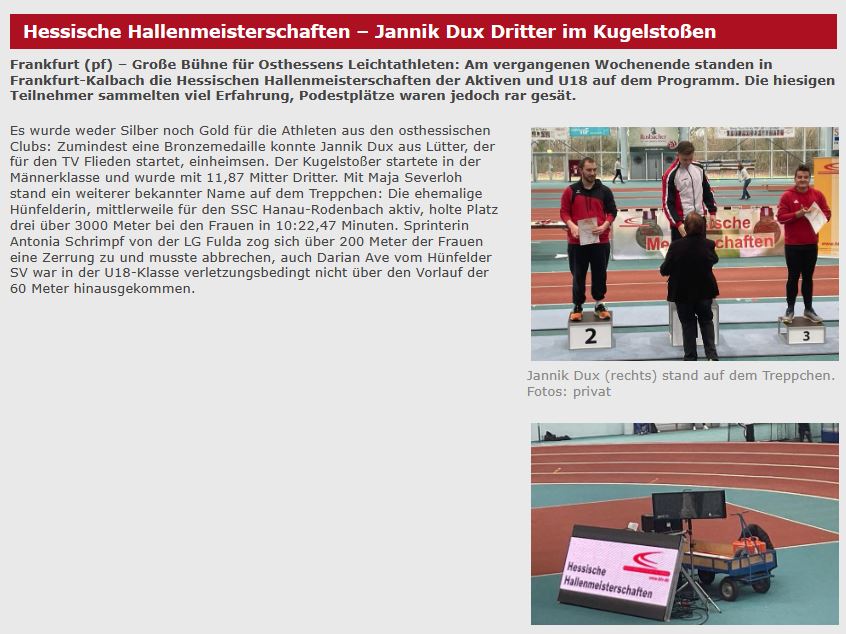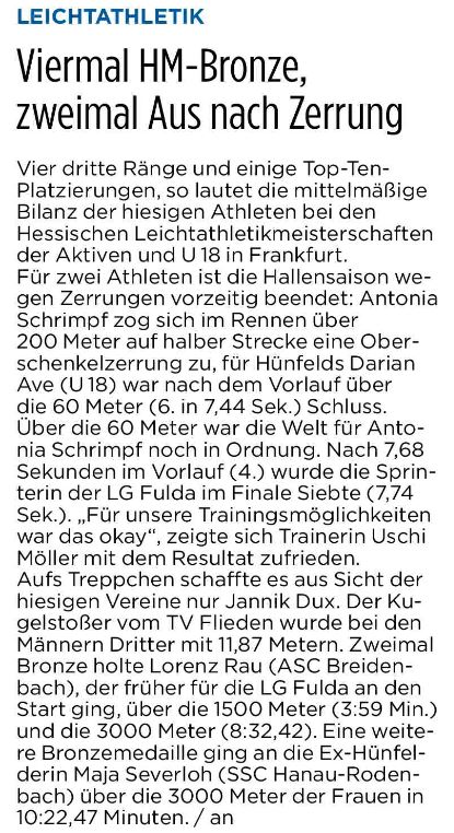 Im vergangenen Jahr stand hier noch "1" Meisterschaft und “1“ Vize-Meisterschaft, in diesem Jahr konnten die Athleten aus dem Kreis Fulda-Hünfeld bei den Hessischen Hallen-Meisterschaften der Aktiven und U18 leider keine Meisterschaft / Vize-Meisterschaft einfahren. Nachfolgend eine kleine Übersicht der Athleten die eine Top-10-Platzierung erreicht haben: