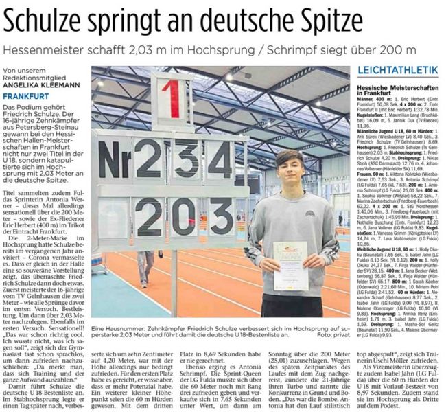 "1" Meisterschaft und “1“ Vize-Meisterschaften konnten Athleten aus dem Kreis Fulda-Hünfeld bei den Hessischen Hallen-Meisterschaften der Aktiven und U18 einfahren. Nachfolgend eine kleine Übersicht der Athleten die eine Top-5-Platzierung erreicht haben: