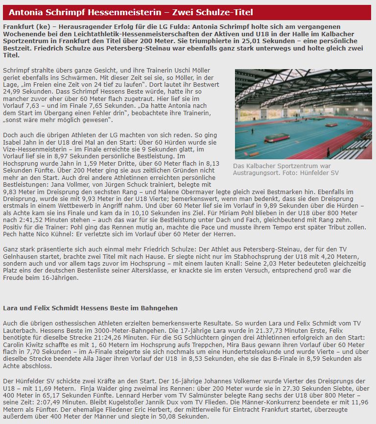 - 1.Platz, Antonia Schrimpf, 200m, 25.01s, LG Fulda