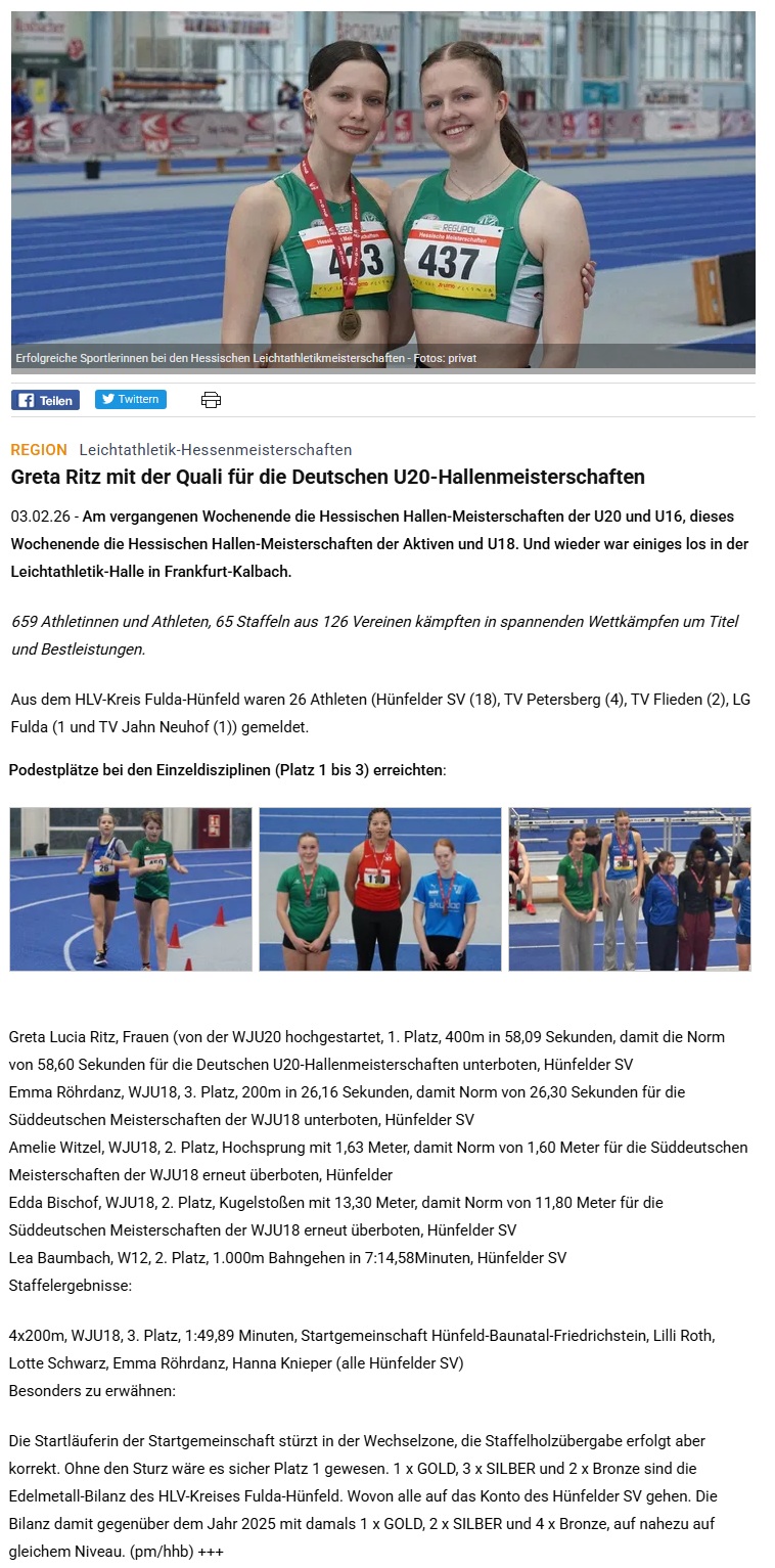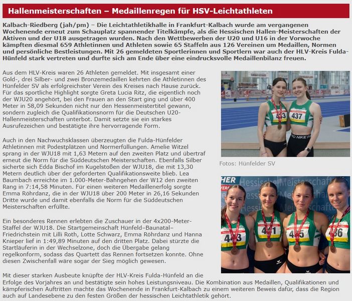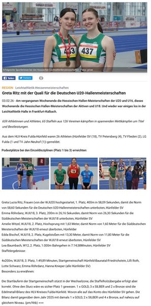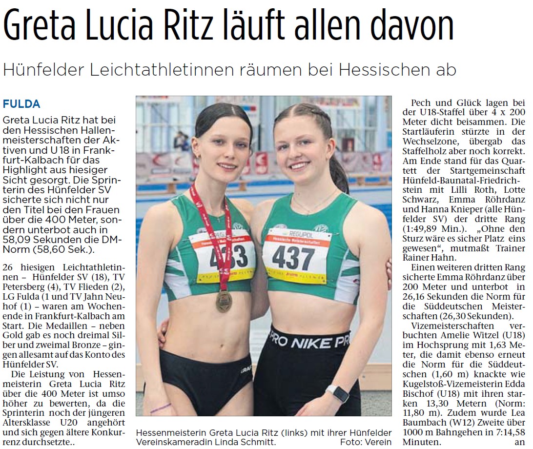 - Greta Lucia Ritz, Frauen (von der WJU20 hochgestartet, 1. Platz, 400m in 58,09 Sekunden, damit die Norm von 58,60 Sekunden für die Deutschen U20-Hallenmeisterschaften unterboten, Hünfelder SV