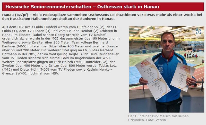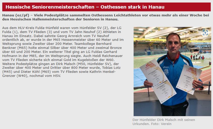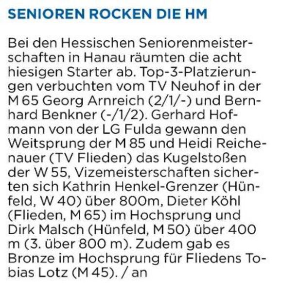Aktuell jagt eine Hessische Meisterschaft bei den Leichtathleten die andere. Heute waren die Seniorinnen und Senioren dran. Vom HLV-Kreis Fulda-Hünfeld waren vom Hünfelder SV (2), der LG Fulda (1), dem TV Flieden (3) und vom TV Jahn Neuhof (2) Athleten im Einsatz. Medaillenplätze erreichten: