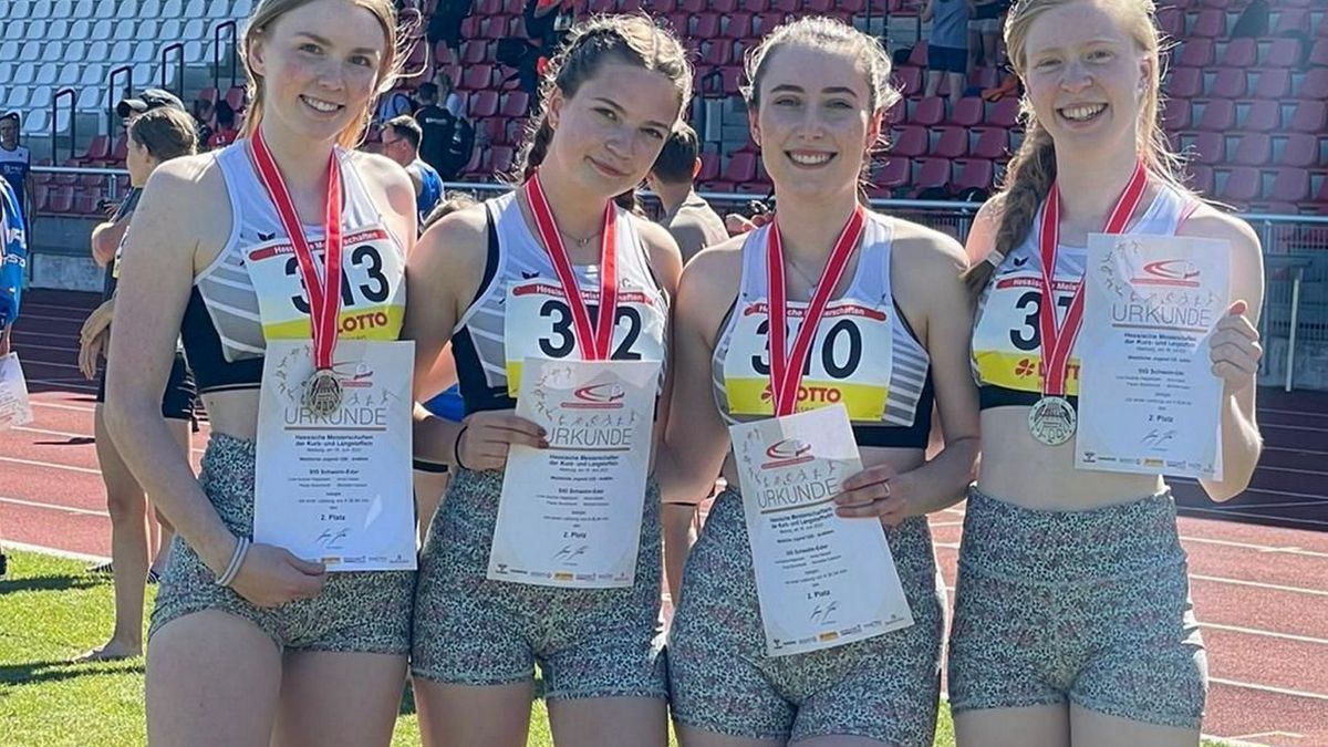 Dagegen kamen beim Silberrang der StG Schwalm-Eder in 4:38,84 Minuten mit Lina-Sophie Hegenbart, Anna Geisel, Paula Stuckhardt und Michelle Kapaun (Foto) über 4mal 400 Meter der weiblichen Jugend U 20 alle vier Athletinnen vom SC Steinatal. „Dieses ist der Lohn für ein langes Durchhalten. Ohne Unterbrechung werden diese Mädchen von mir seit 2013 im SC Steinatal trainiert und betreut“, freute sich der DLV-Altinternationale Karlo Seck, der zudem ohne die erkrankte Junia Auel auskommen musste.