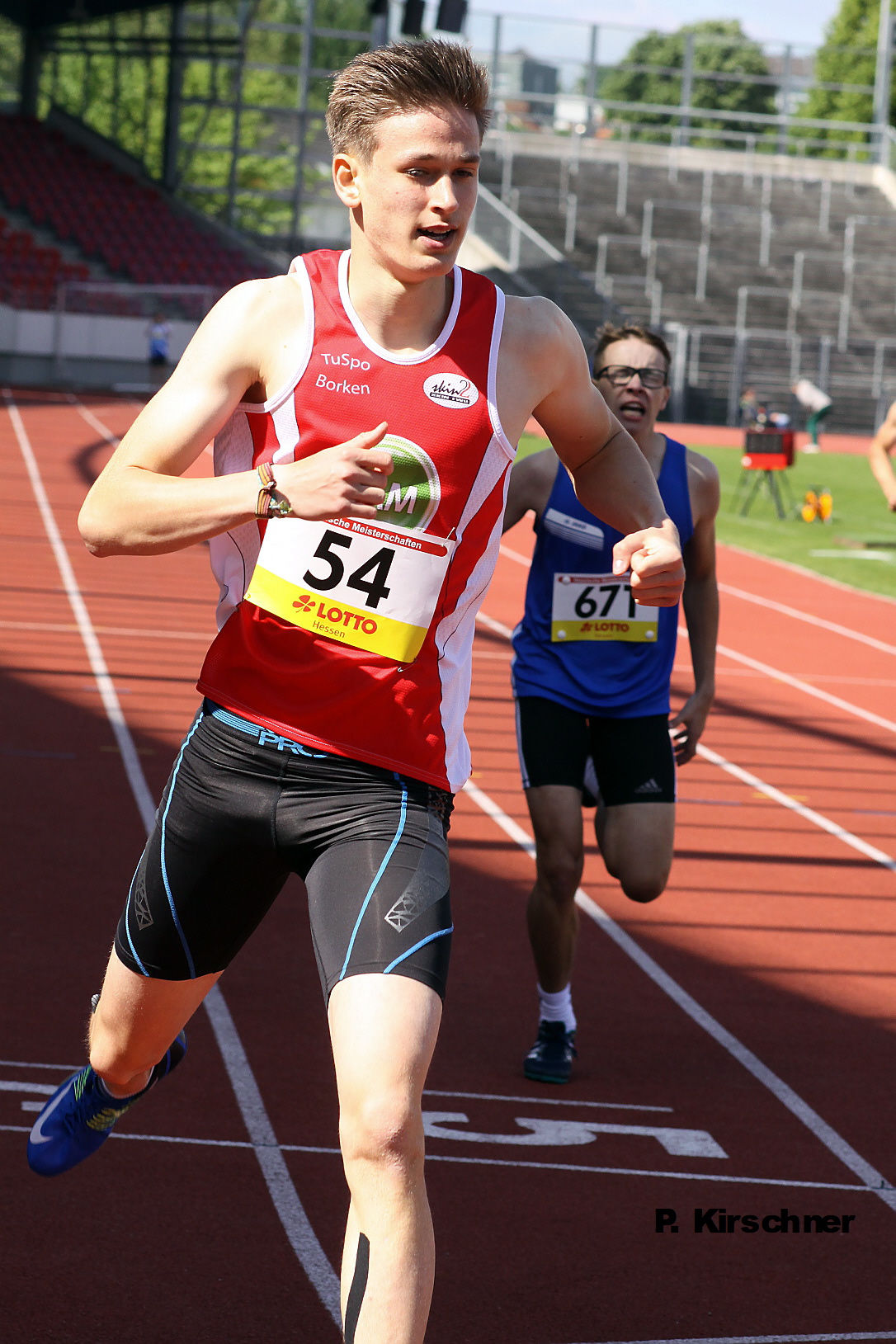 Fünf Vize-Meisterschaften gab es für die männliche Jugend im Auestadion zu feiern. Über eine Stadionrunde wird Paul Kirschner (TuSpo Borken) immer schneller und lief in 51,66 bis auf zwei Zehntelsekunden an den Sieger Robin Pfahls (TV Gelnhausen/ 51,46 s) heran. Am nächsten Tag fügte Paul über 200 Meter noch eine Bronzemedaille hinzu. Nach der Bestleistung von 23,55 Sekunden im Vorlauf belegte er im Endlauf mit 23,62 Sekunden den 3. Platz. Stark der Auftritt von Mittelstreckler Nick Frölich (KSV Baunatal). Nach Platz vier am Vortag über 800 Meter (2:02,72) erkämpfte der 16-Jährige aus Ermetheis als Zweiter über 1500 Meter in 4:15,50 Minuten mit Bastian Mrochen (LG Reinhardswald/4:13,34) einen nordhessischen Doppelsieg.