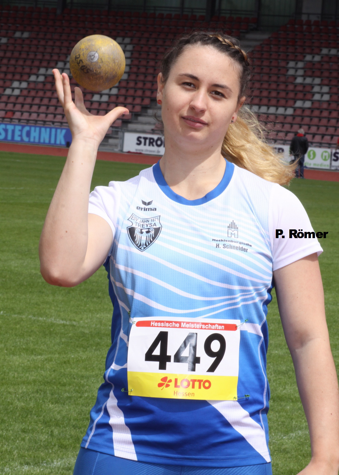 Im Kugelstoßen demonstrierte Patrizia Römer (ESV Jahn Treysa) bereits im dritten Durchgang mit 15,17 m (4 kg) wer im Ring das Sagen hat und bestätigte anschließend mit 15,14 m diese Weite. Damit lag die 21-Jährige einen Meter vor ihrer HLV-Konkurrentin Lara Herdner (LGE Frankfurt/14,12 m). Nach einer Wettkampfpause ist Carolin Friedrich (LAV Kassel) wieder da. Die Siebenkämpferin aus Guxhagen eröffnete den Wettkampf im Speerwerfen (600 g) mit 43,91 m. Doch erst im letzten Versuch gelang der 19-Jährigen mit 44,43 m der knappe Erfolg vor der inzwischen aufgerückten Stephanie Schlenz (DJK Freigericht/ 44,23 m,