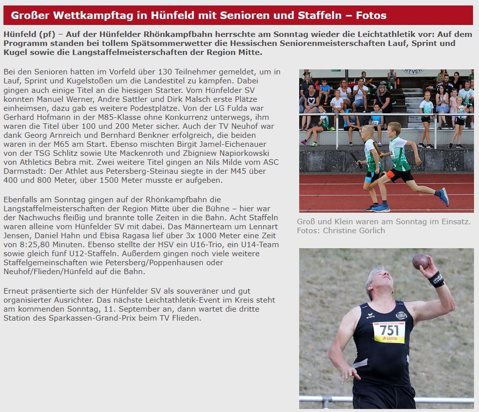 Nachdem am 10. Juli bereits in Stadtallendorf Teil 1 durchgeführt worden war (Schwerpunkt: Sprung +Wurfdisziplinen) war es dann am 04.09. auf der Hünfelder Rhönkampfbahn soweit: Fleißigster Medaillensammler war Tim Reitz von der LG Reinhardswald. Er holte in der M40 insgesamt 5x Gold (100m, 200m, 400m, 110m Hü, 400m) sowie 1x Bronze (Kugel). Die Mittel-/Langstreckenläufe der W55 waren dagegen fest in der Hand von Gabi Baltruschat (Spiridon Frankfurt). Sie war die schnellste über 800, 1500m sowie 5000m. Neben den Laufdisziplinen wurde auch das Kugelstoßen angeboten. Besonders erwähnenswert die 12,71m von Hendrik Schaak (SSV Vellmar) in der M60 sowie die 9,69m von Anne Rauschenbach (LG Bad Soden/Sulzbach/Neuenhain) in der W40. Gleichzeitig waren diese Hessischen Meisterschaften auch die letzte Qualifikationsmöglichkeit für die Hessischen Senioren für die zwei Wochen später stattfindende DM. Und während bei der DM die 400m Hürden und die 5.000m aus organisatorischen Gründen nicht angeboten werden, standen diese Disziplinen bei den Hessischen Meisterschaften auf der Rhönkampfbahn im Programm. Außerdem wurden in einem 2-stündigem Zeitfenster noch die Regionalmeisterschaften der Staffeln durchgeführt. Hier waren alle Altersklassen von den Schülern bis zu den Senioren vertreten. „Durch die Zusammenlegung beider Meisterschaften ist es uns gelungen, eine generationsübergreifende Veranstaltung zu organisieren.“ so Rainer Hahn vom ausrichtenden Hünfelder SV. Insgesamt wäre es natürlich schön, wenn es wieder einen Veranstalter gibt, der alle Disziplinen gleichzeitig ausrichtet. Sollte dies aber nicht machbar sein, so ist eine Teilung der Meisterschaft eine sinnvolle Alternative.
