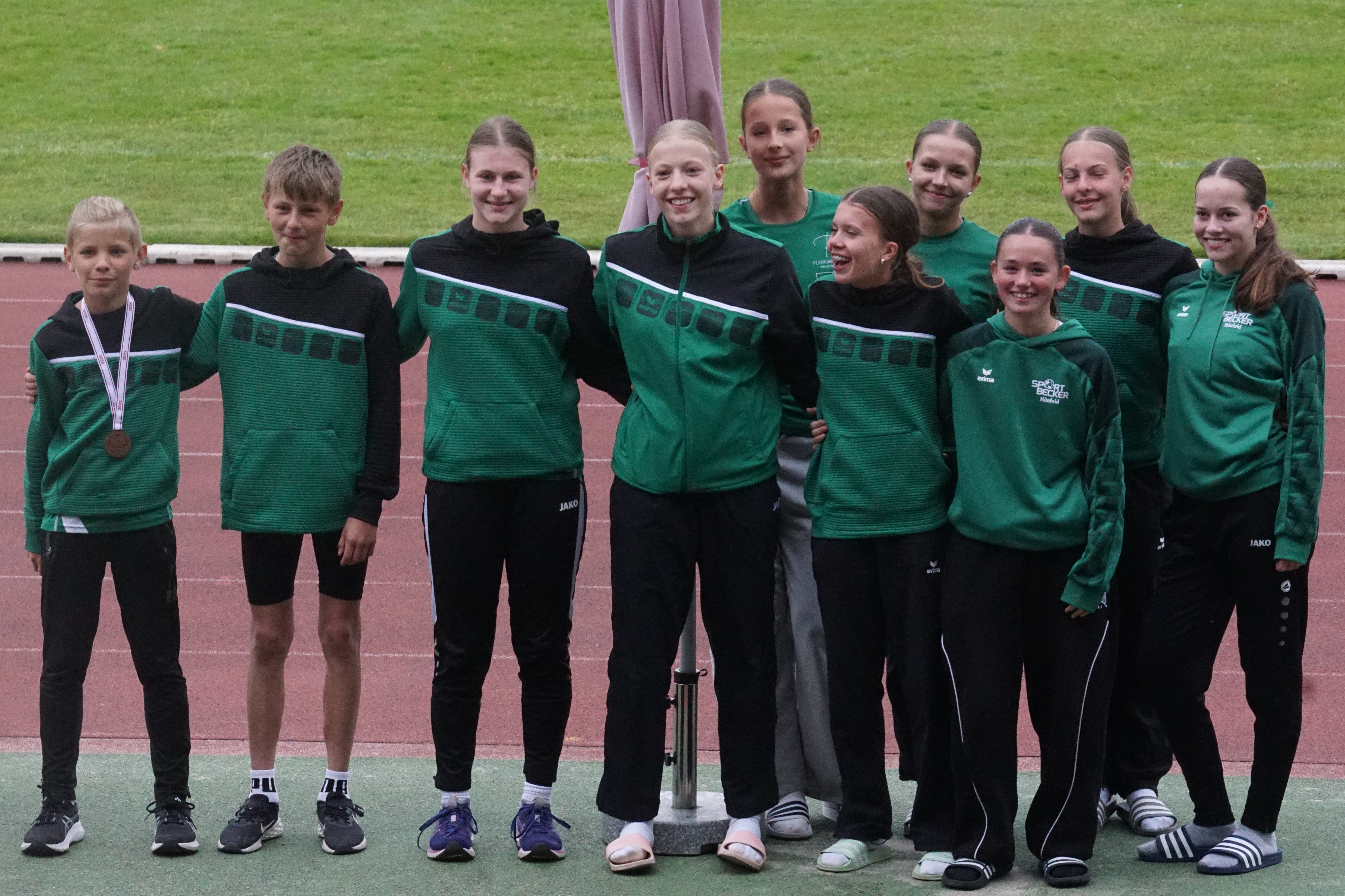 Am Samstag ging es mit den Athletinnen der WJU16 und den Athleten der MJU14 los. Bei den Athletinnen vom Hünfelder SV bestand schon eine gewisse Erwartungshaltung, man wollte schon aufs Treppchen, und die Vorzeichen dafür waren auch nicht schlecht. Die Ergebnisse der Mittelhessischen Block-Meisterschaften ließen schon einiges erwarten. Durch die Abwesenheit von 5 Athletinnen und dem vorzeitigen Ende von Lotte Schwarz nach der ersten Disziplin kamen dann doch schon einige Zweifel hoch. Wie sich dann aber am Ende des Wettkampfs zeigte waren die Zweifel unbegründet. Am Ende des langen Wettkampftages standen 7.530 Punkte auf dem Konto der 1. Mannschaft des Hünfelder SV (Amelie Witzel (2.588), Emma Röhrdanz (2.551), Svea Witzel (2.391)), was auch gleichzeitig die Hessenmeisterschaft bedeutete. 215 Punkte dahinter die Mannschaft der Eintracht Frankfurt auf dem 2. Platz.