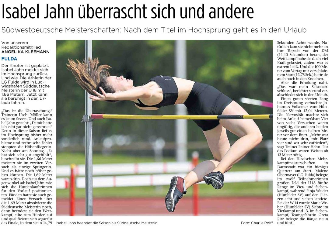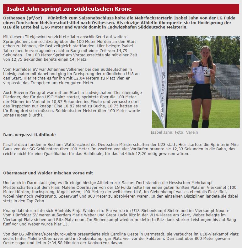 Malene Obermayer von der LG Fulda holte hier einen guten fünften Platz im Vierkampf (100 Meter Hürden, Hochsprung, Kugelstoßen, 100 Meter) der weiblichen U18, im Siebenkampf war es ebenfalls Platz fünf, wobei hier noch Weitsprung, Speerwurf und 800 Meter zu absolvieren waren. Knapp dahinter reihte sich Hünfelds Finja Waider ein; sie wurde im U18-Siebenkampf Siebte und im Vierkampf Neunte. In den einzelnen Disziplinen landeten beide dabei stets in den Top-10.