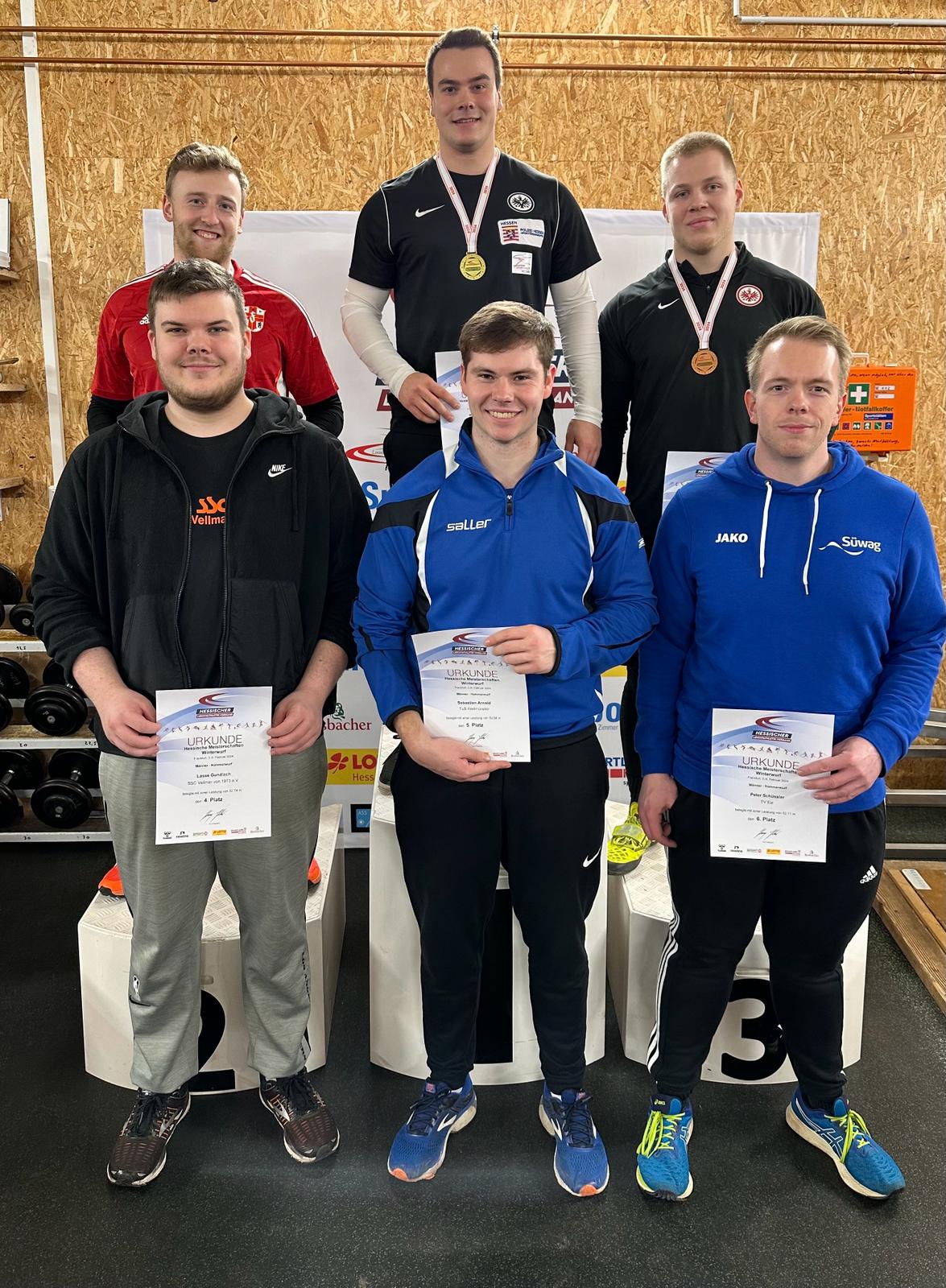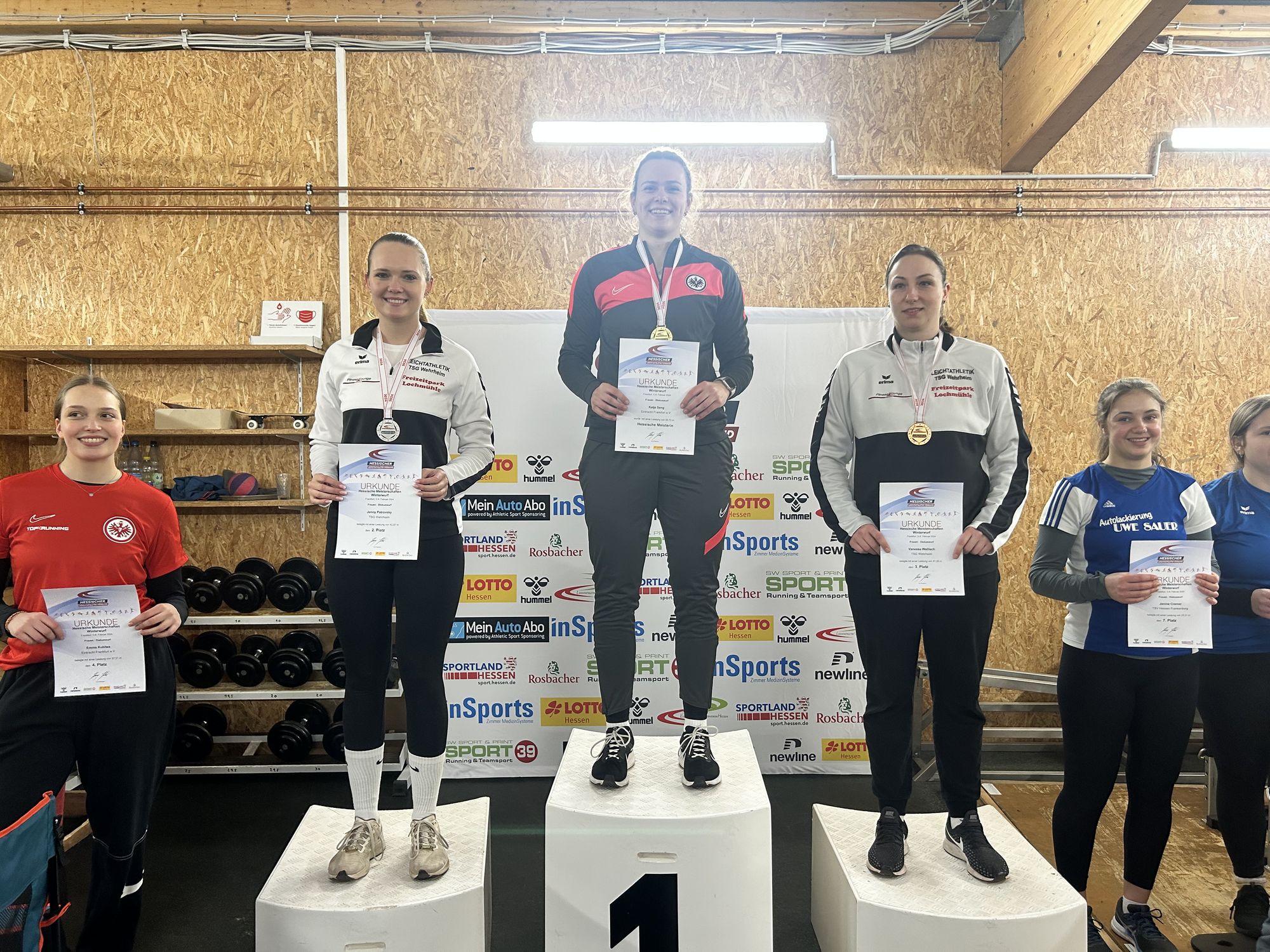 Nach der kurzfristigen Umlegung der Winterwurf-Meisterschaften aufrgund eine Wildschwein-Plage auf dem Wurffeld in Darmstadt, fanden die Hammer- und Diskuswurf Wettbewerbe am Samstag bzw. Sonntag in dem Wurfhaus des Bundesstützpunktes an der Hahnstraße in Frankfurt statt. Die Speerwurfwettbewerbe blieben am Sonntag in Darmstadt.