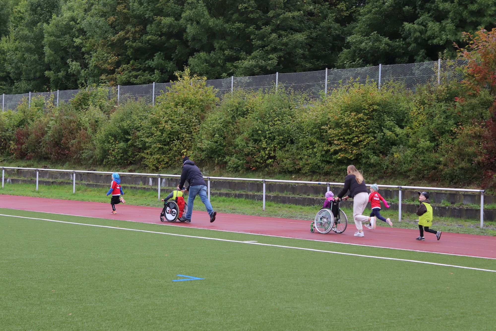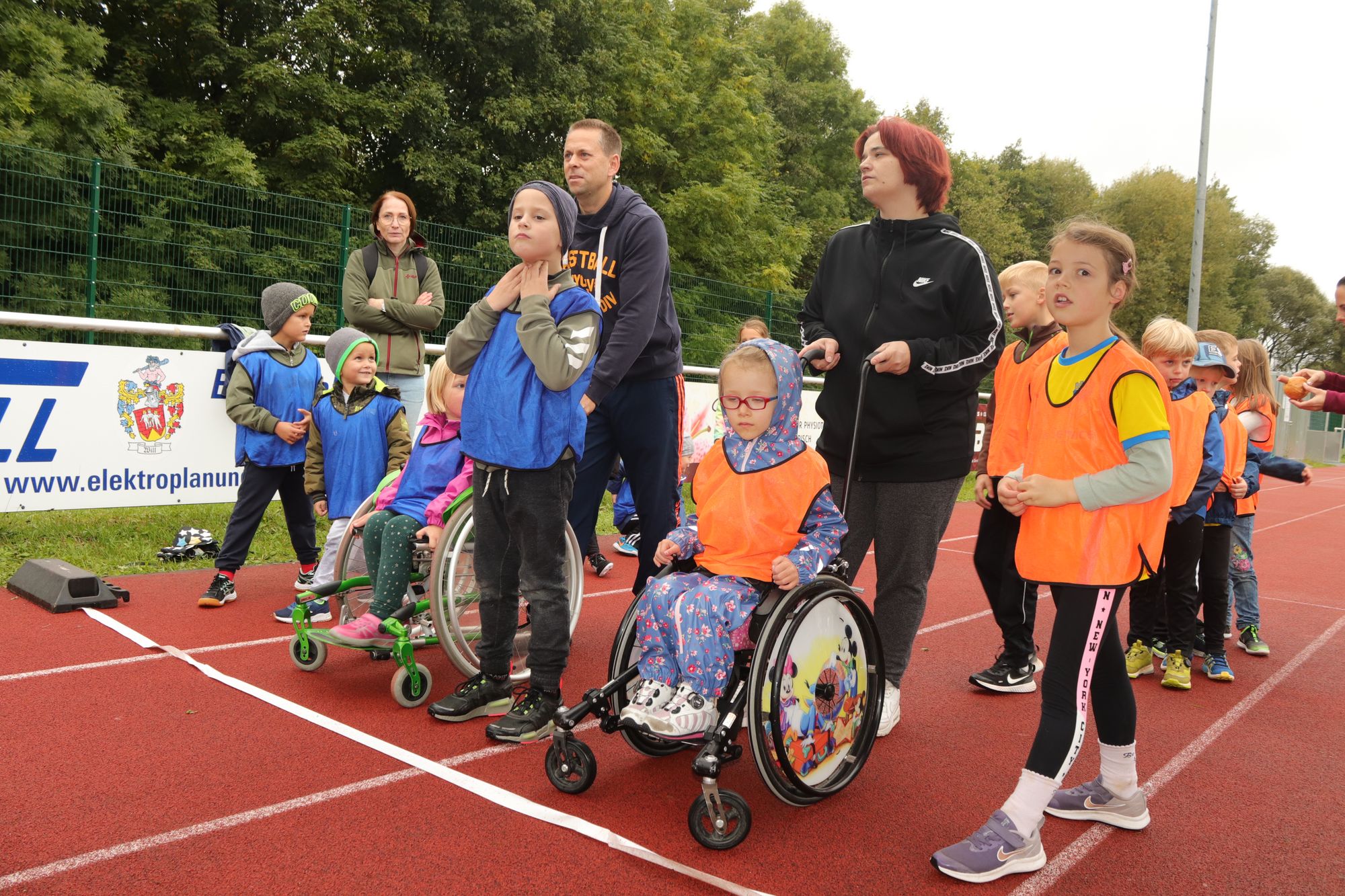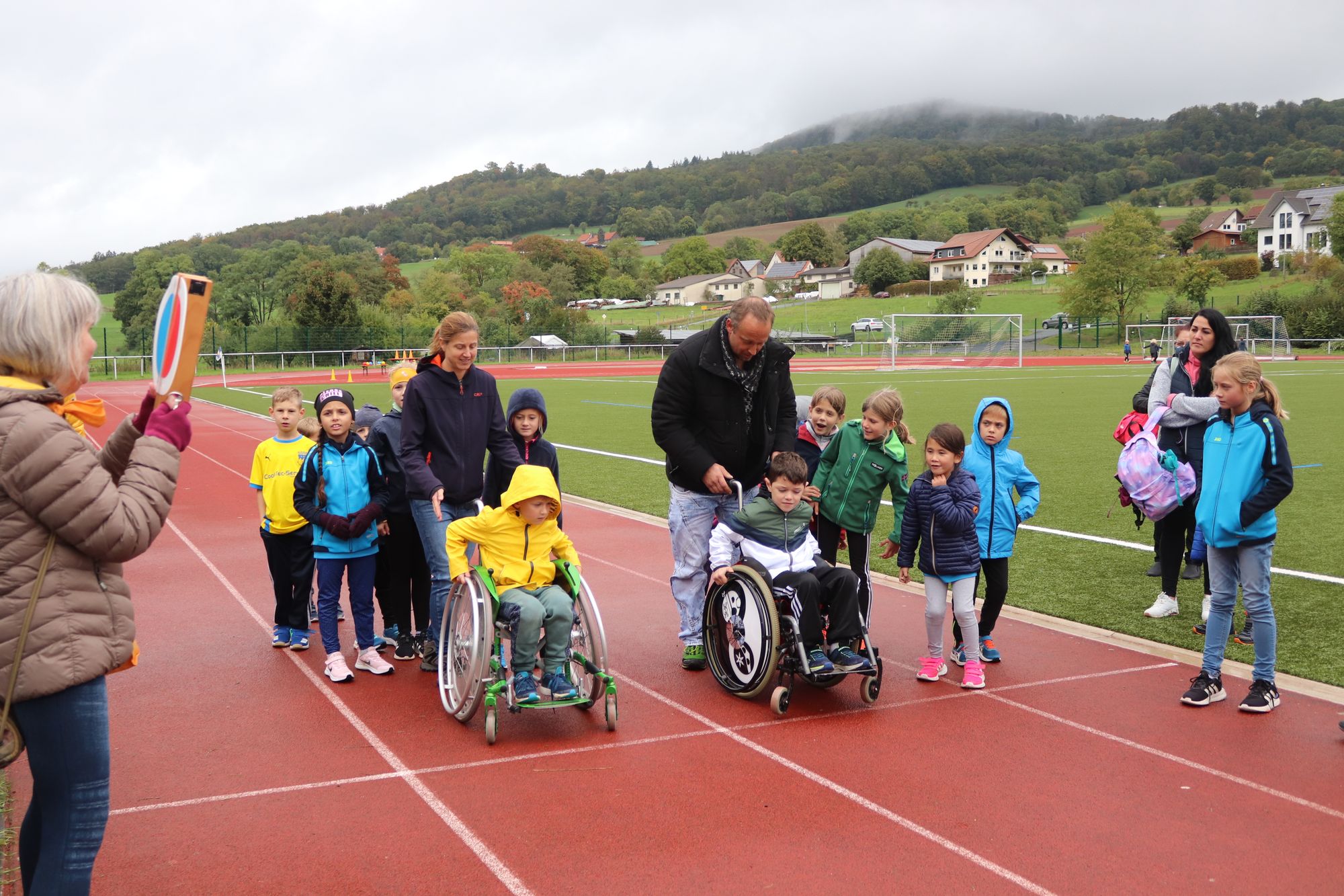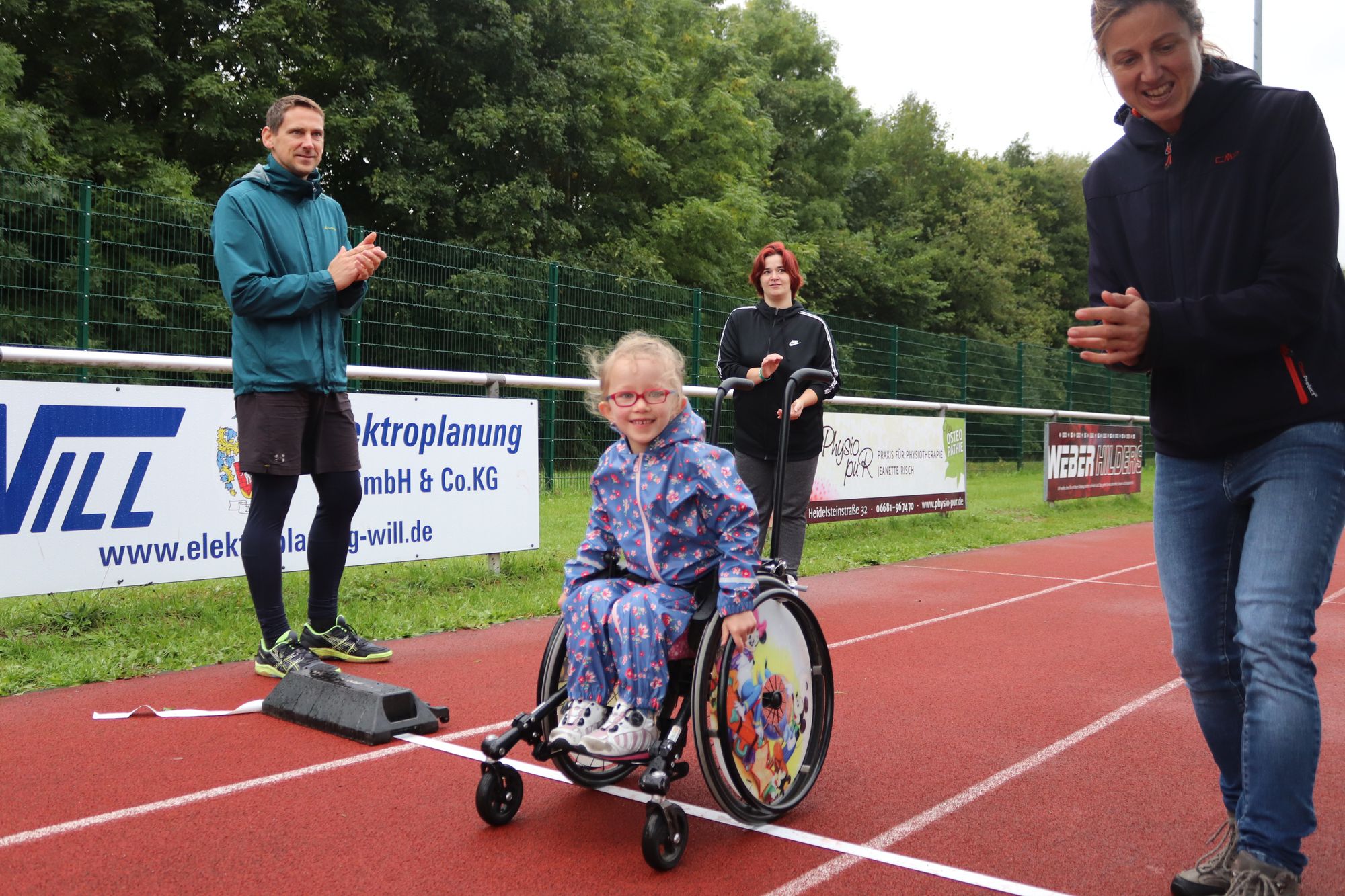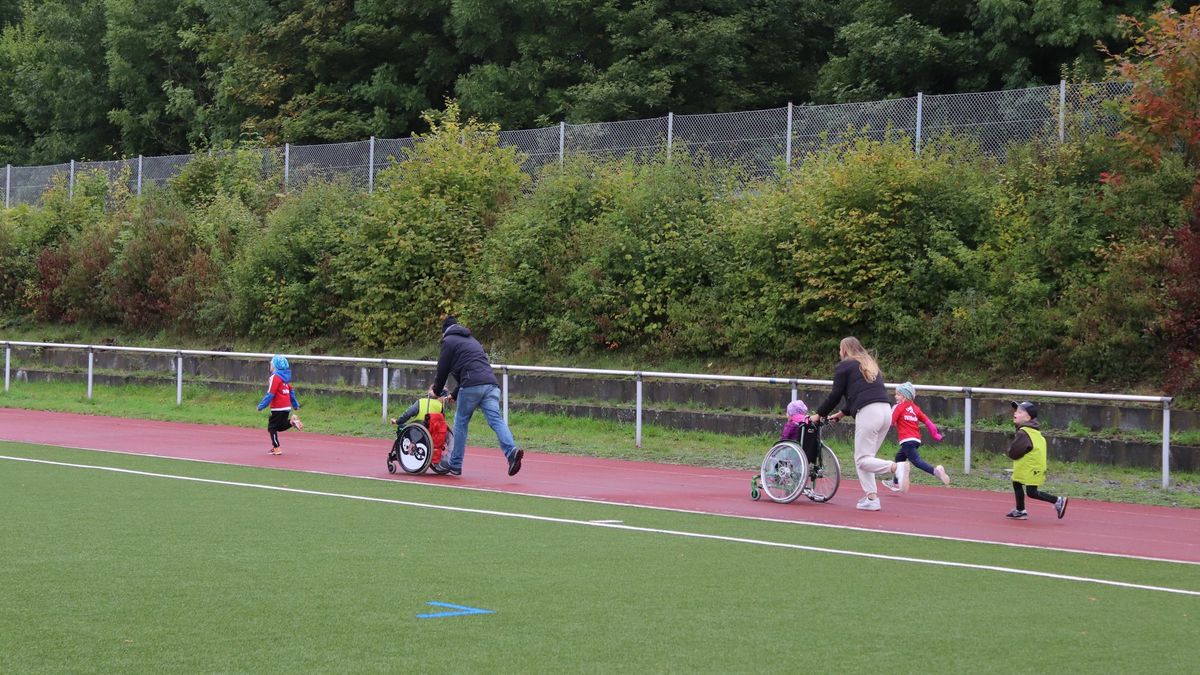 Ihrer Erfahrung nach lasse sich im Training die Förderung der leistungsstarken Kinder mit der Teilhabe der beeinträchtigten problemlos vereinbaren. „Gerade den Ehrgeizigen und Begabten tut es auch gut, nicht immer im Mittelpunkt zu stehen“, meint sie. Umgekehrt bemüht sich Christine Honikel, Joanna trotz deren Muskelkrankheit nicht „in Watte zu packen“. Daher habe für sie die Teilnahme auch angesichts des nasskalten Wetters nicht infrage gestanden. Zwar als letzte, aber stolz kamen Mutter und Tochter nach 400 Metern ins Ziel und klatschten sich ab. Noch mehr leuchteten Joannas Augen nur, als Trainer Simon Geil ihr wie allen anderen Teilnehmenden bei der Siegerehrung die verdiente Medaille umhängte. Da erhielt das olympische Motto „Dabei sein ist alles“ eine erweiterte Bedeutung.