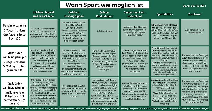 Der Landessportbund Hessen (lsbh) hat eine Grafik erstellt, die dabei helfen soll besser zu erkennen, wann derzeit Sport in welchem Umfang möglich ist. Für weitere Details am besten auf der Website des lsbh vorbeischauen.