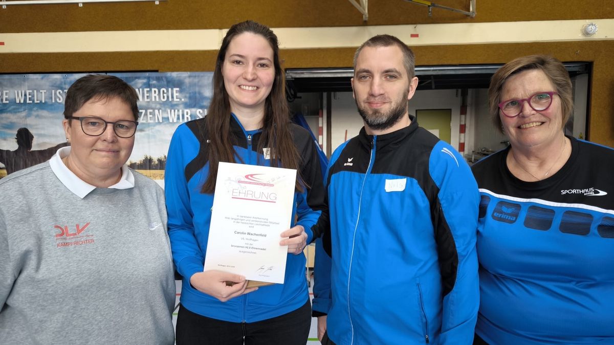 Die frisch gewählte neue Vorsitzende des Leichtathletik-Kreises Hofgeismar Melanie Berger (VfL Veckerhagen) zeichnete Wachenfeld vor den Wettkämpfen mit der bronzenen Ehrennadel vom Hessischen Leichtathletik-Verbandes (HLV) aus.