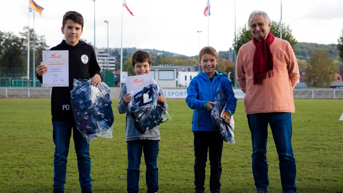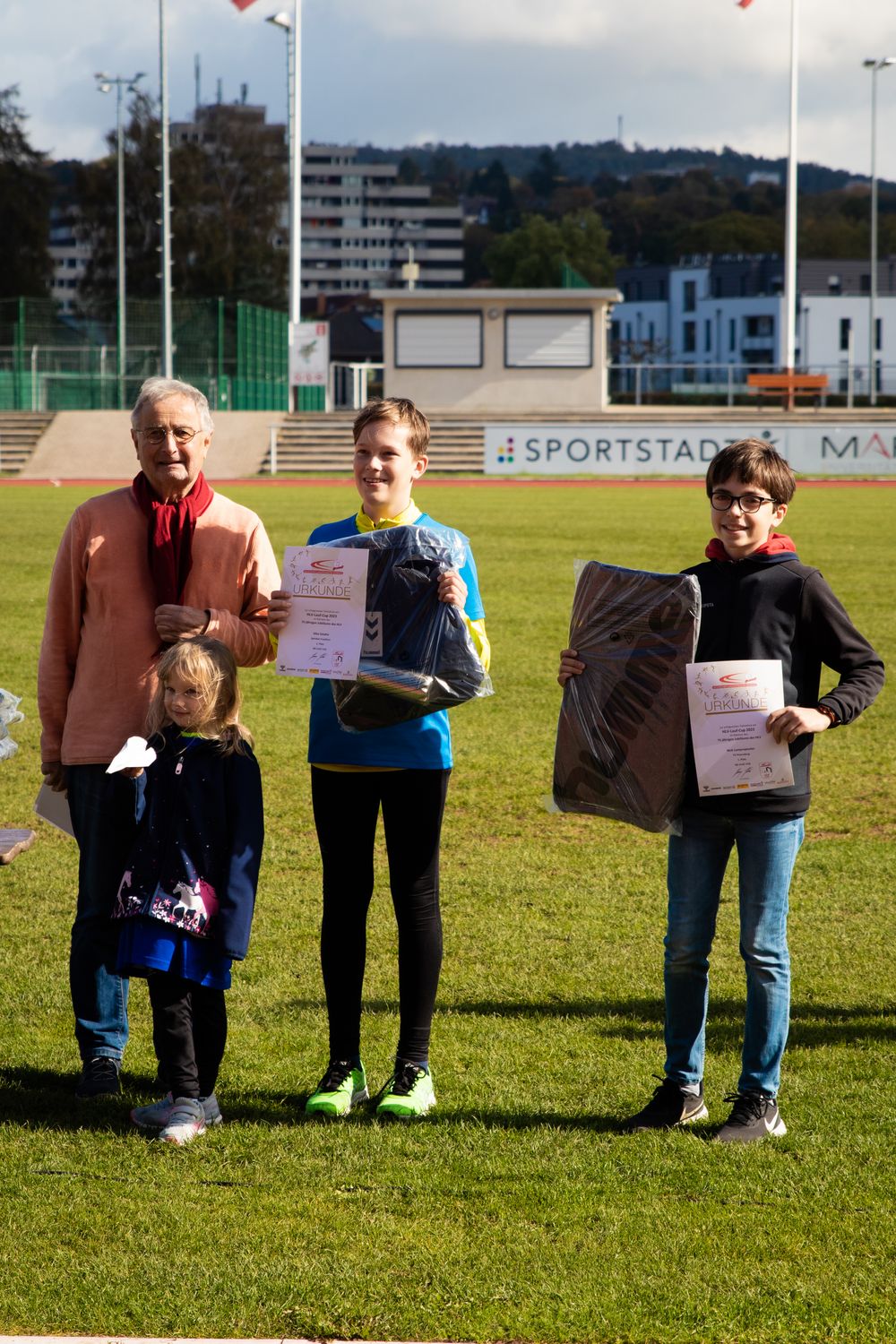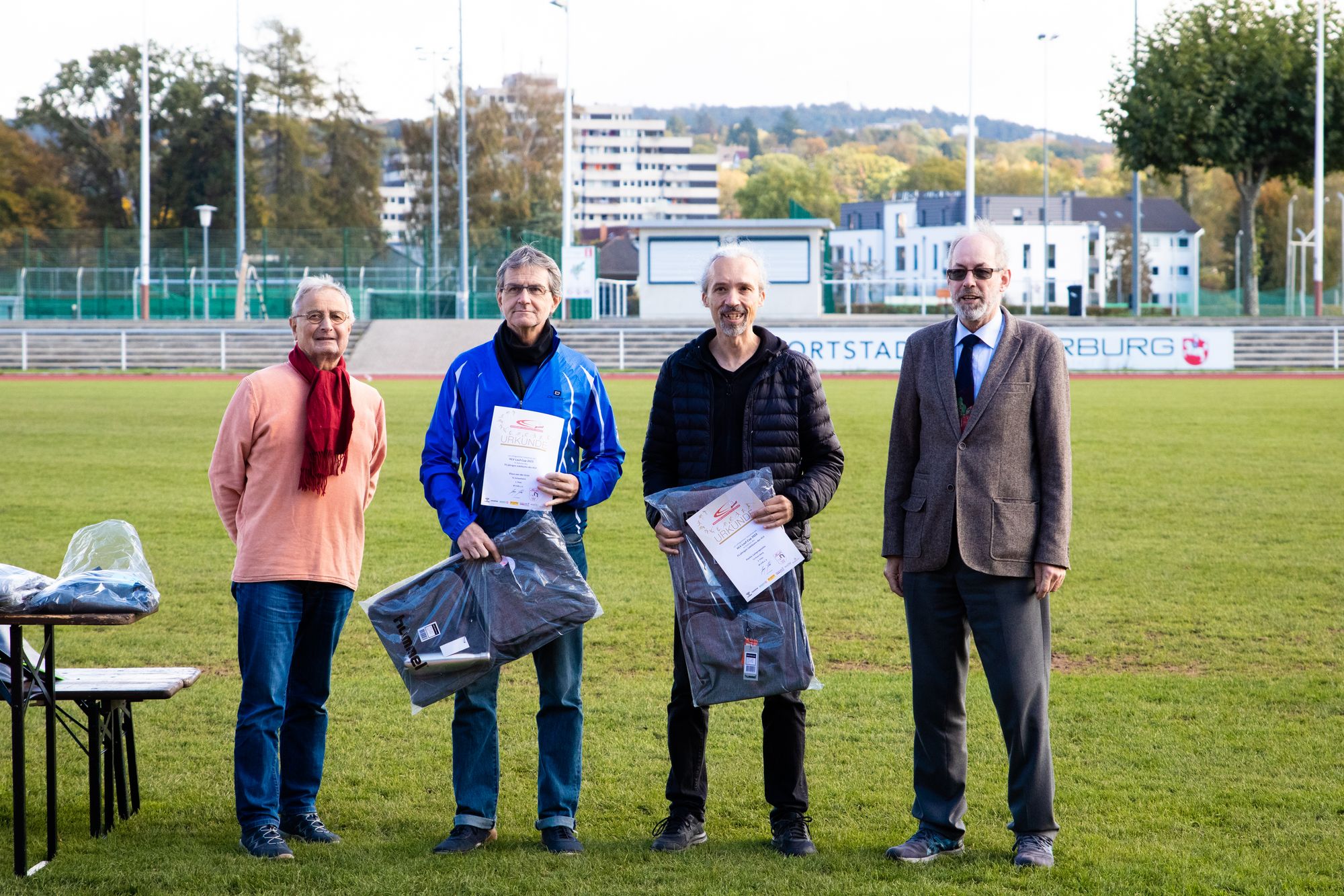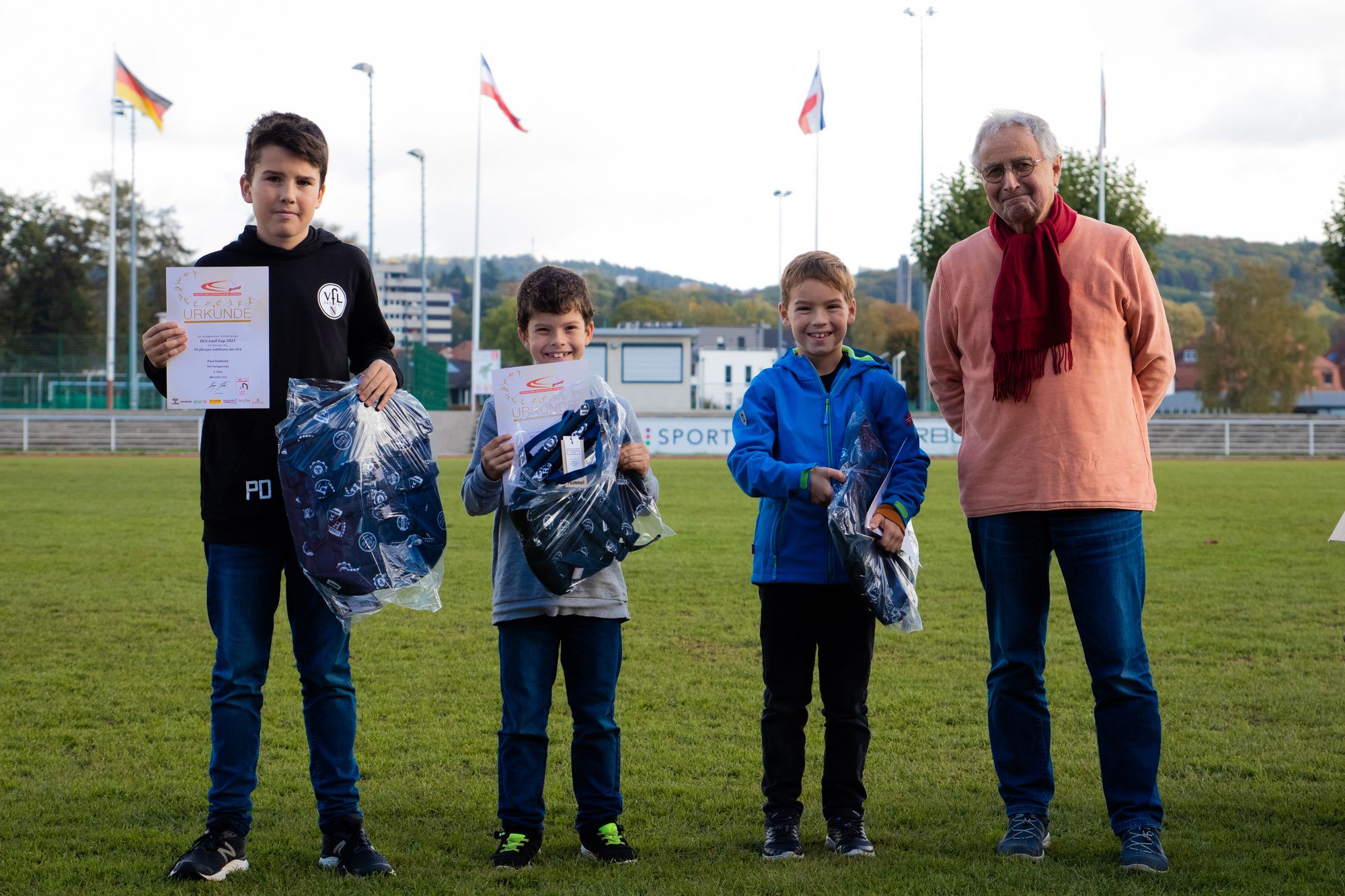 Zusammen mit dem Vizepräsidenten Kreise, Erich Schneider, ehrte er die drei Erstplatzierten in den Wertungen WK U10/12, W U14/16, W U18 u. ä. sowie MK U10/12, M U14/16 und M U18 u. ä.. Dabei wurde deutlich, dass offenbar nicht jeder den kurzfristig bekanntgegebenen Termin wahrnehmen konnte. In der WK U10/12 waren die beiden Erstplatzierten (jeweils 10 km), Lenja Lenz, LG Gensungen, und Nina Dedecke, TSV Heiligenrode, anwesend und durften jeweils einen Rucksack des Sponsors Hummel entgegennehmen. Ninas Brüder Jan und Paul kamen auf die Plätze 1 und 2 der MK U10/12 und holten sich ebenfalls ihre Preise ab. Erfreulich aus Veranstaltersicht war hier, dass auch der Drittplatzierte Felix Liese von Winnies Laufvögel Vellmar von der Tribüne auf die Rasenfläche kam. In der W U14/16 vertrat die Drittplatzierte Tabea Siebert die Farben des FTSV Heckershausen und freute sich über ihren Preis. Als Sieger der M U14/16 wurde Nick Lampropoulos, TV Petersberg, auf den Rasen des Stadions gebeten. Während leider keine der ersten drei Frauen anwesend war, nahmen die Männer auf den Plätzen 1 und 3, Klaus von der Grün von der TG Schwanheim für 210 absolvierte Kilometer und Pavlos Lampropoulos, ebenfalls TV Petersberg, für 200 zurückgelegte Kilometer ihre erlaufenen Präsente in Empfang.
