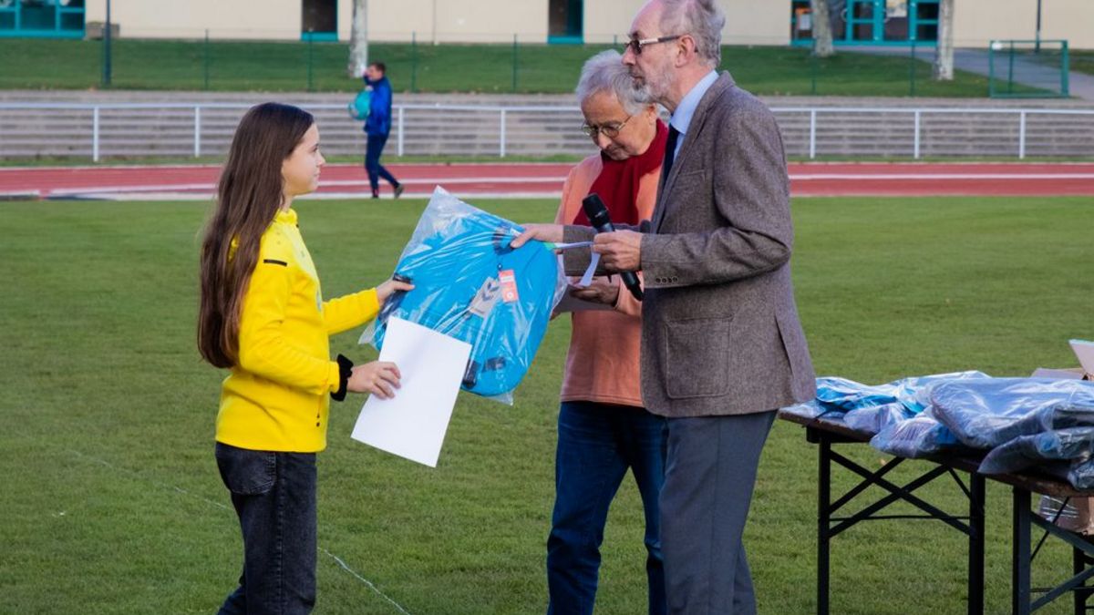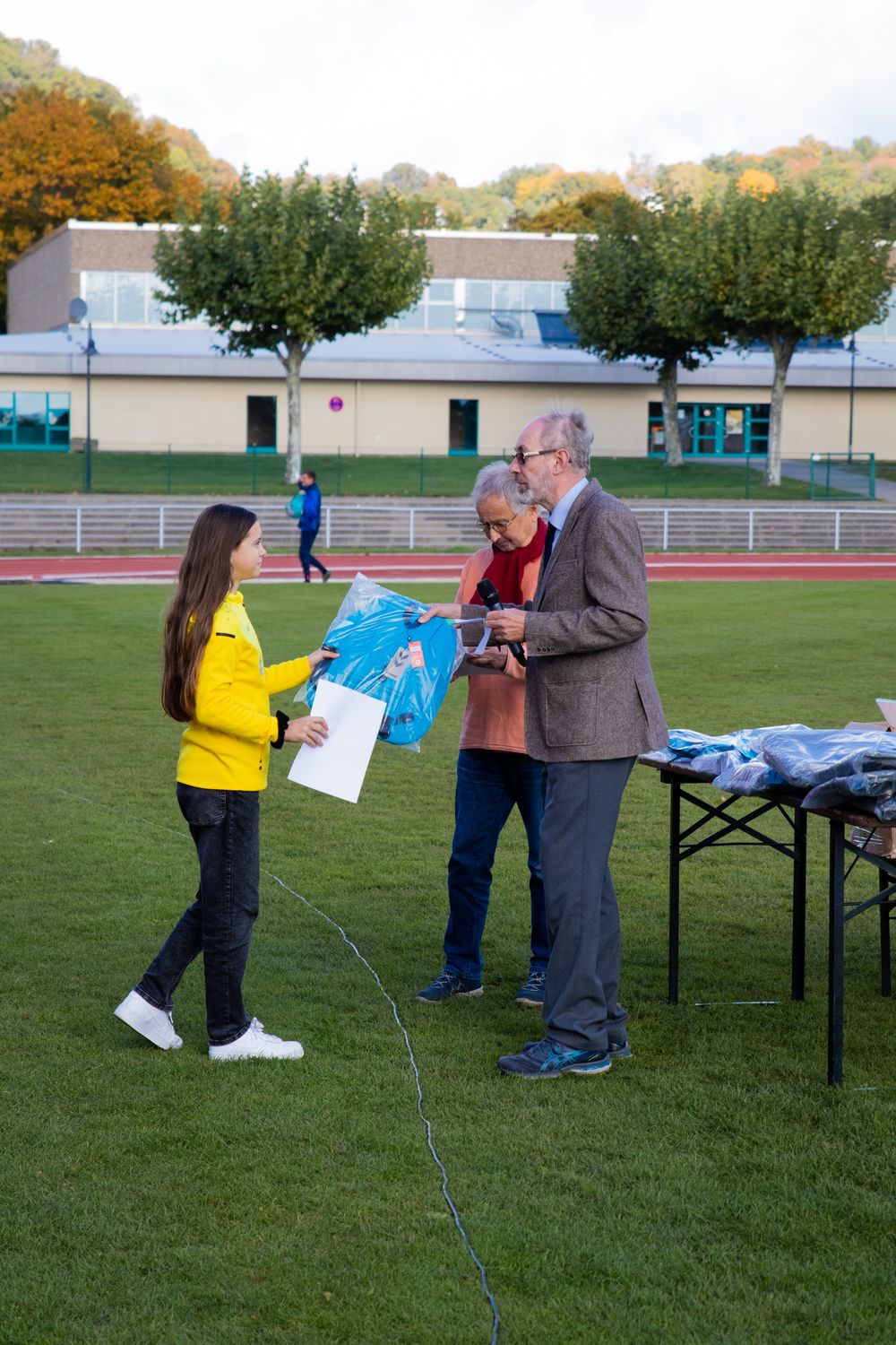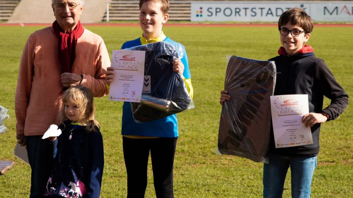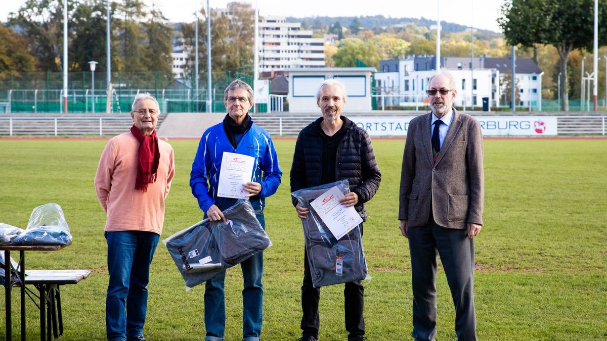 Zusammen mit dem Vizepräsidenten Kreise, Erich Schneider, ehrte er die drei Erstplatzierten in den Wertungen WK U10/12, W U14/16, W U18 u. ä. sowie MK U10/12, M U14/16 und M U18 u. ä.. Dabei wurde deutlich, dass offenbar nicht jeder den kurzfristig bekanntgegebenen Termin wahrnehmen konnte. In der WK U10/12 waren die beiden Erstplatzierten (jeweils 10 km), Lenja Lenz, LG Gensungen, und Nina Dedecke, TSV Heiligenrode, anwesend und durften jeweils einen Rucksack des Sponsors Hummel entgegennehmen. Ninas Brüder Jan und Paul kamen auf die Plätze 1 und 2 der MK U10/12 und holten sich ebenfalls ihre Preise ab. Erfreulich aus Veranstaltersicht war hier, dass auch der Drittplatzierte Felix Liese von Winnies Laufvögel Vellmar von der Tribüne auf die Rasenfläche kam. In der W U14/16 vertrat die Drittplatzierte Tabea Siebert die Farben des FTSV Heckershausen und freute sich über ihren Preis. Als Sieger der M U14/16 wurde Nick Lampropoulos, TV Petersberg, auf den Rasen des Stadions gebeten. Während leider keine der ersten drei Frauen anwesend war, nahmen die Männer auf den Plätzen 1 und 3, Klaus von der Grün von der TG Schwanheim für 210 absolvierte Kilometer und Pavlos Lampropoulos, ebenfalls TV Petersberg, für 200 zurückgelegte Kilometer ihre erlaufenen Präsente in Empfang.