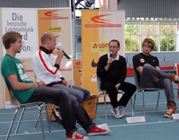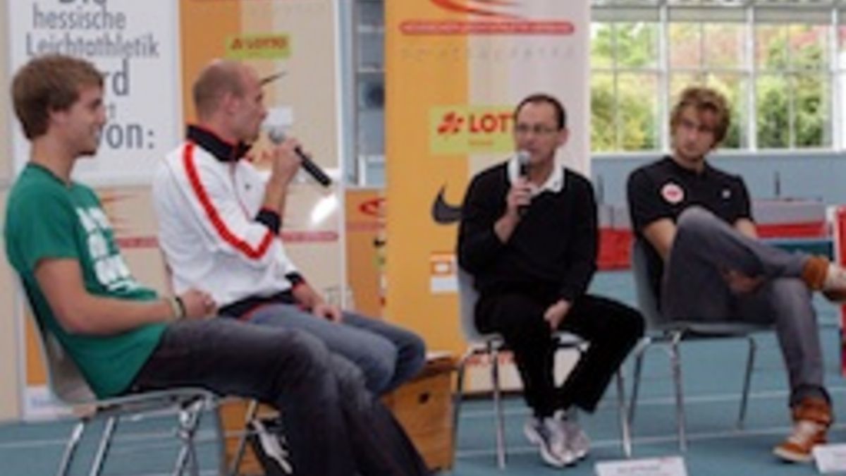 Um nicht zuletzt diesen Athleten eine Perspektive für eine lange Leichtathletikkarriere aufzuzeigen, die nicht zwangsläufig wegen des zeitlich immer ausgedehnteren Schulalltags oder spätestens nach dem Erwerb des Abiturs beendet werden muss, führte im Anschluss Arnulf Rücker, Laufbahnberater am Olympiastützpunkt Hessen, eine Podiumsdiskussion zum Thema „Duale Karriere“. Mit Gesa Krause (Eliteschule des Sports Carl-von-Weinberg-Schule Frankfurt; Deutsche Rekordhalterin und Vierte der U20-WM im Hindernislauf), Daniel Jeske (Sportinternat Bad Sooden-Allendorf; Deutscher Stabhochsprung-Vizemeister und Hessenrekordler), Jan-Felix Knobel (Hochschule RheinMain; Juniorenweltmeister im Zehnkampf 2008) und Martin Günther (Polizeisportfördergruppe Wiesbaden/Verwaltungsfachhochschule Wiesbaden, Achter der Hallen-WM im Hochsprung mit 2,30m) schilderten vier der erfolgreichsten HLV-Kaderathleten eindrucksvoll, wie gut sie Training und Wettkämpfe jeweils mit Schule, Ausbildung bzw. Beruf abstimmen und vereinbaren können. Viele, häufig unbekannte Hilfestellungen wurden detailliert erläutert, sodass einige Nachwuchsathleten nun deutlich mehr über die Wichtigkeit der Karriereplanung bescheid wissen. Zum Abschluss stellten die jeweiligen Kadertrainer ihren Athleten und deren Vereinstrainern ihre Überlegungen zur Trainings- und Wettkampfplanung für eine erfolgreiche Saison 2010/2011 vor, für die die HLV-Kadereröffnung ein gelungener Auftakt war. Julia Nestle