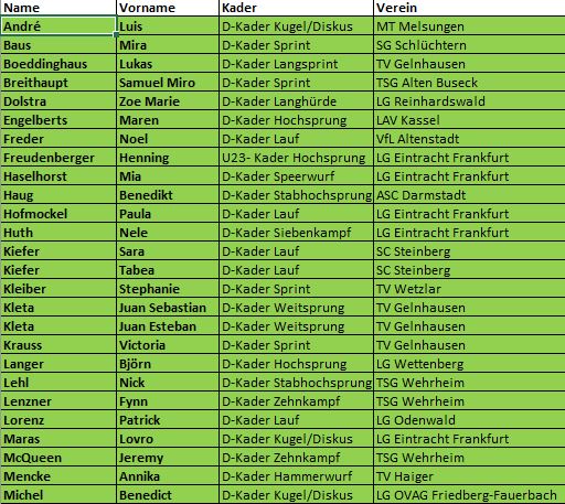 Mit der Kadernominierung des Hessischen Leichtathletik-Verbandes (HLV) im Alten Kurfürstlichen Gymnasium in Bensheim hat Ende September die offizielle Vorbereitung auf die Saison 2019 begonnen. 47 neue Nachwuchsathletinnen und -athleten sind in die HLV-Kader aufgenommen worden, die unterteilt sind in die Blöcke Wurf, Sprint/Hürden, Mehrkampf/Sprung sowie Lauf.