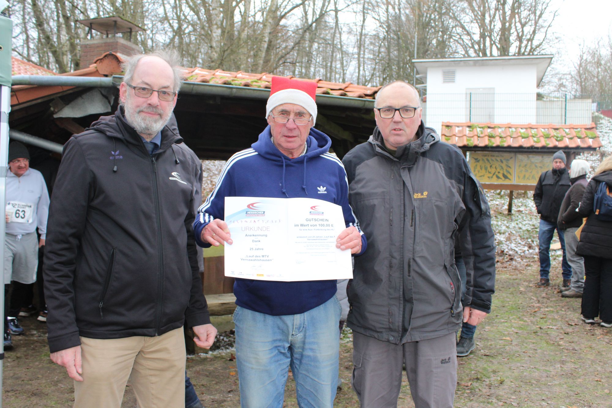 Vernawahlshausen – Große Auszeichnung für den MTV Vernawahlshausen: Nach der Siegerehrung der Bambini- und Schülerläufe wurde der Silvesterlauf-Chef Eduard Lange stellvertretend für den Verein durch den Hessischen Leichtathletik-Verband (HLV) geehrt. HLV Laufwart Jochen Miersch überreichte an der Grillhütte im Wesertaler Ortsteil Arenborn für den mittlerweile 26. Silvesterlauf eine Urkunde und einem 100 € Gutschein für eine Aus- und Fortbildung beim HLV.