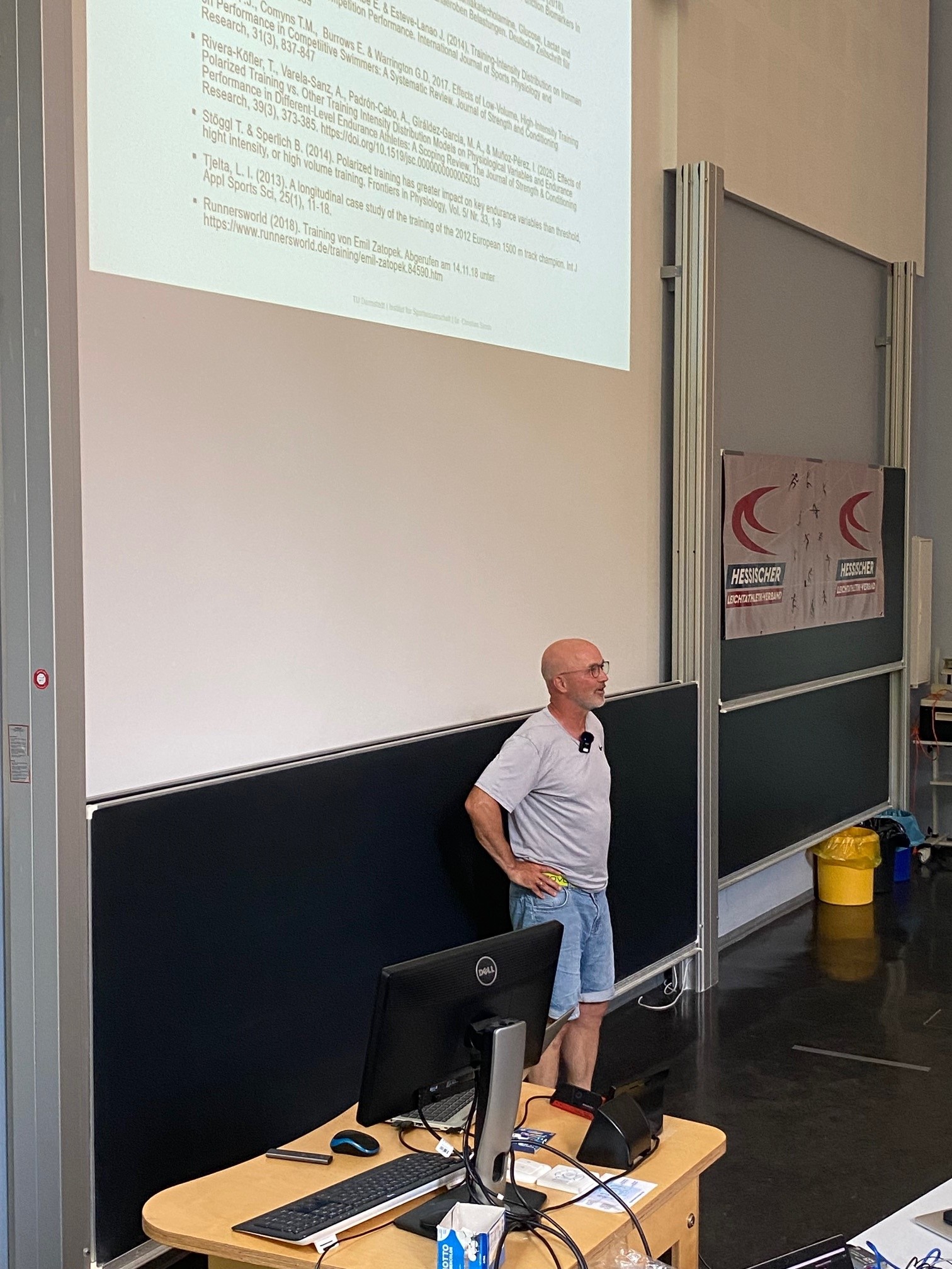 Dr. Christian Simon, Fachleiter Leichtathletik an der TU Darmstadt, erläuterte im dritten Vortrag des Tages die Unterschiede und Synergien zwischen High Intensity Interval Training (HIIT) und High Volume Training (HVT) im Ausdauerbereich. Die Teilnehmer erfuhren, dass HIIT besonders effektiv für die Steigerung von VO₂max, Laufökonomie und Schnelligkeit ist, während HVT vor allem für den Fettstoffwechsel und die Grundlagenausdauer bei längeren Distanzen unerlässlich bleibt. Besonders praxisnah war die Erkenntnis, dass eine clevere Kombination beider Trainingsformen – das sogenannte polarisierte Training – aktuell als das effektivste Modell gilt. Die Teilnehmenden nahmen wertvolle Impulse zur individuellen Trainingssteuerung sowie zur Balance zwischen Belastung und Regeneration mit nach Hause.