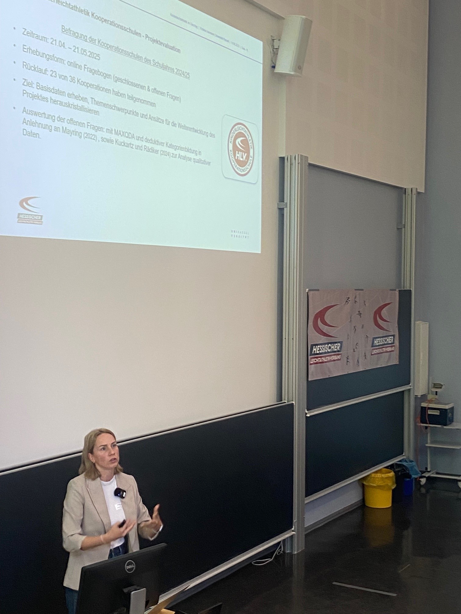Im zweiten Vortrag des Tages stellte Kristina Isermann, HLV-Fachwartin für den Schulsport, die entscheidende Rolle der Zusammenarbeit zwischen Schulen und Vereinen in der Kinderleichtathletik heraus – insbesondere im Ganztagsbetrieb. Sie betonte, wie wichtig es ist, Kinder schon früh für Sport zu begeistern und ihnen durch gezielte Kooperationen den Zugang zur Leichtathletik zu erleichtern. Ein zentrales Beispiel hierfür ist die erfolgreiche HLV-Initiative „Kinderleichtathletik-Kooperationsschulen gesucht“, die Isermann den Teilnehmenden vorstellte.