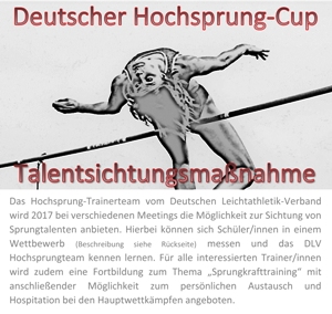 Von den vier Talentsichtungsmaßnahmen im Rahmen des Deutschen Hochsprung-Cups findet eine in Hessen statt - am 14. Mai in Hattersheim. Die Cup-Serie ist vom Trainerteam des Deutschen Leichtathletik-Verbandes initiiert worden, also auch von der hessischen Hochsprung-Landestrainerin Sophia Sagonas. Ziel ist es, Talente frühzeitig zu sichten, kennenzulernen und zu unterstützen. Dabei sind die Sichtungsmaßnahmen in bestehende Meetings integriert. Neben Hattersheim im Main-Taunus-Kreis sind dies Essen-Überruhr (29. April), Winnenden (13. Mai) und Aschheim (27. Mai). Athleten der Altersklassen U14 und U16 können mit Sprüngen von beiden Seiten in beliebiger Technik, beispielsweise Flop und Schere, ihr Talent unter Beweis stellen. Pro Bein und Sprunghöhe sind jeweils zwei Versuche möglich. Letztlich werden die besten Einzelergebnisse addiert und der/die Sieger/in ermittelt. Und zu gewinnen gibt es auch etwas: Die drei Bestplatzierten jeder Sichtungsmaßnahme (männlich/weiblich) erhalten je zwei Eintrittskarten für das Internationale Hochsprung-Meeting in Eberstadt, das in diesem Jahr vom 25. bis 27. August zum 39. Mal stattfindet.
