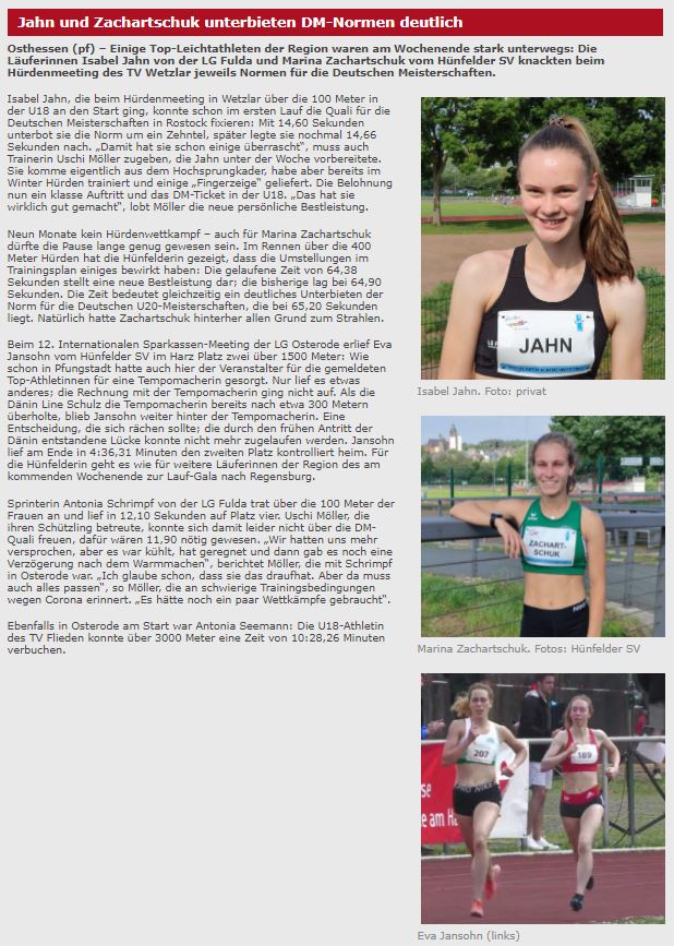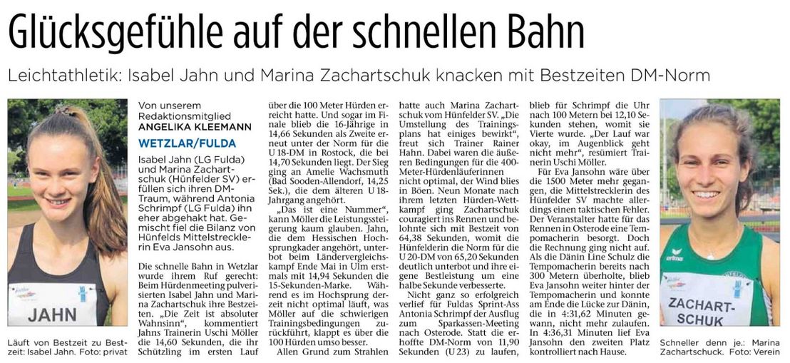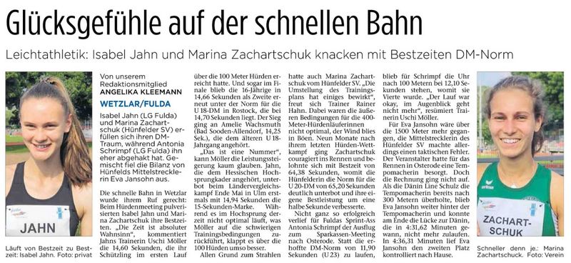 Isabell Jahn (LG Fulda) und Marina Zachartschuk (Hünfelder SV) knacken mit Bestzeiten DM-Norm