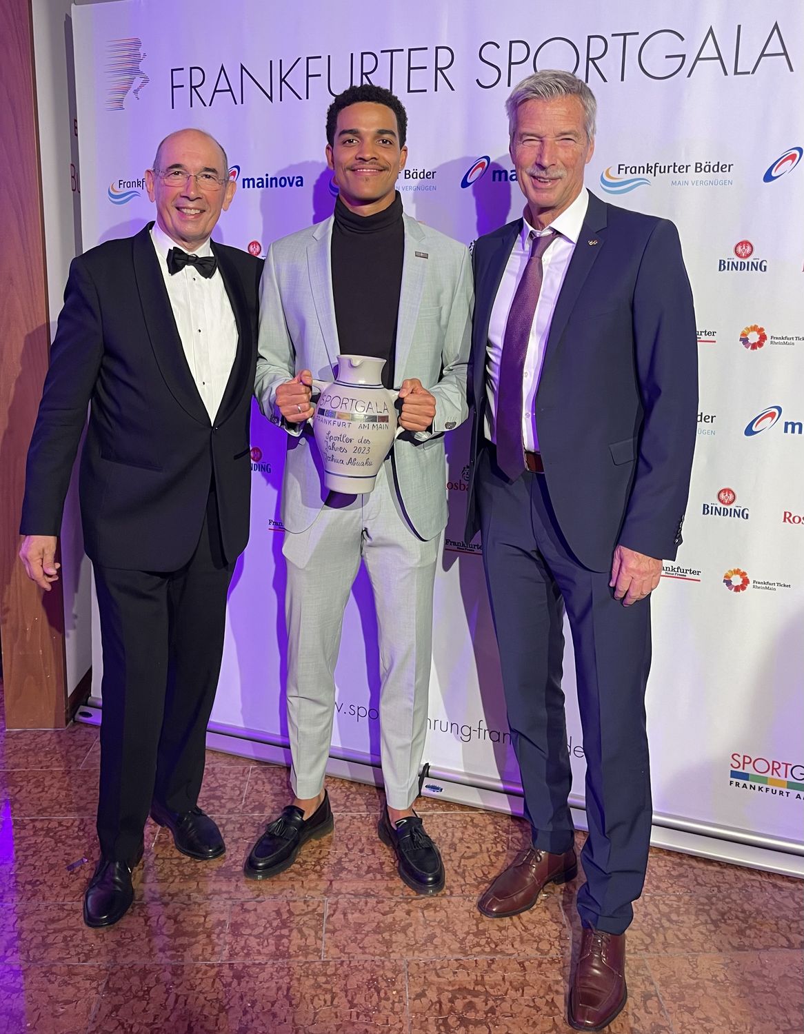 Eintrachtler Joshua Abuaku ist am Samstag als Frankfurts "Sportler des Jahres" 2023 ausgezeichnet worden. Er war im Sommer in Budapest (Ungarn) als erster Deutscher seit 36 Jahren in ein WM-Finale über 400 Meter Hürden eingezogen und dort Achter geworden. Schon seit vielen Jahren ist Volker Beck als Trainer an seiner Seite. Der Olympiasieger von 1980 nahm bei der Frankfurter Sportgala am letzten Samstag den Preis als "Trainer des Jahres" entgegen. Maryse Luzolo (Königsteiner LV), WM-Finalistin im Weitsprung, war bei der Auszeichnung in der Frauen-Kategorie Zweite.