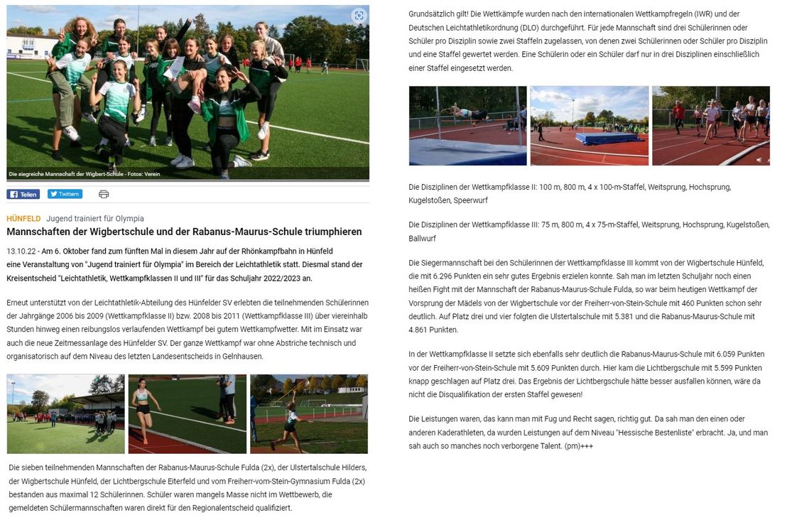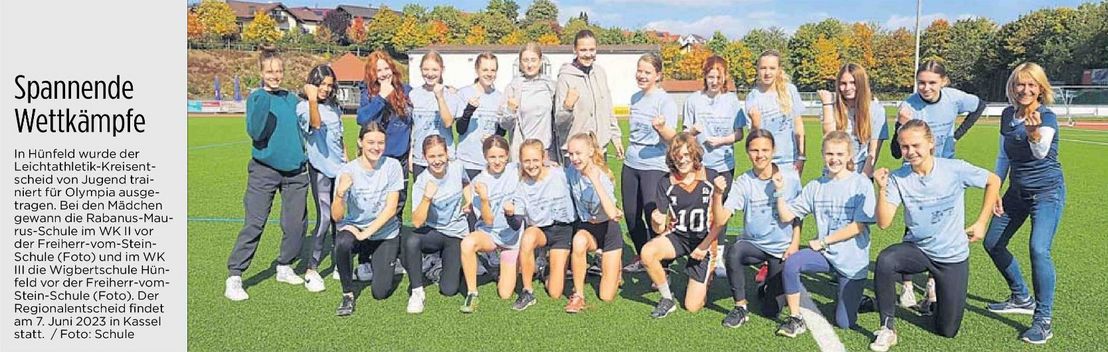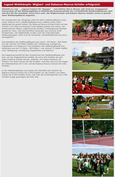 Heute, am 6.Oktober 2022, fand zum fünften Mal in diesem Jahr auf der Rhönkampfbahn in Hünfeld eine Veranstaltung von “Jugend trainiert für Olympia“ im Bereich der “Leichtathletik“ statt. Heute der Kreisentscheid "Leichtathletik, Wettkampfklassen II und III" für das Schuljahr 2022/2023. Erneut unterstützt von der Leichtathletik-Abteilung des Hünfelder SV erlebten die teilnehmenden Schülerinnen der Jahrgänge 2006 bis 2009 (Wettkampfklasse II) bzw. 2008 bis 2011 (Wettkampfklasse III) über 4,5 Stunden hinweg einen reibungslos verlaufenden Wettkampf bei gutem Wettkampfwetter. Mit im Einsatz auch die neue Zeitmessanlage des Hünfelder SV! Der ganze Wettkampf war ohne Abstriche technisch und organisatorisch auf dem Niveau des letzten Landesentscheids in Gelnhausen.