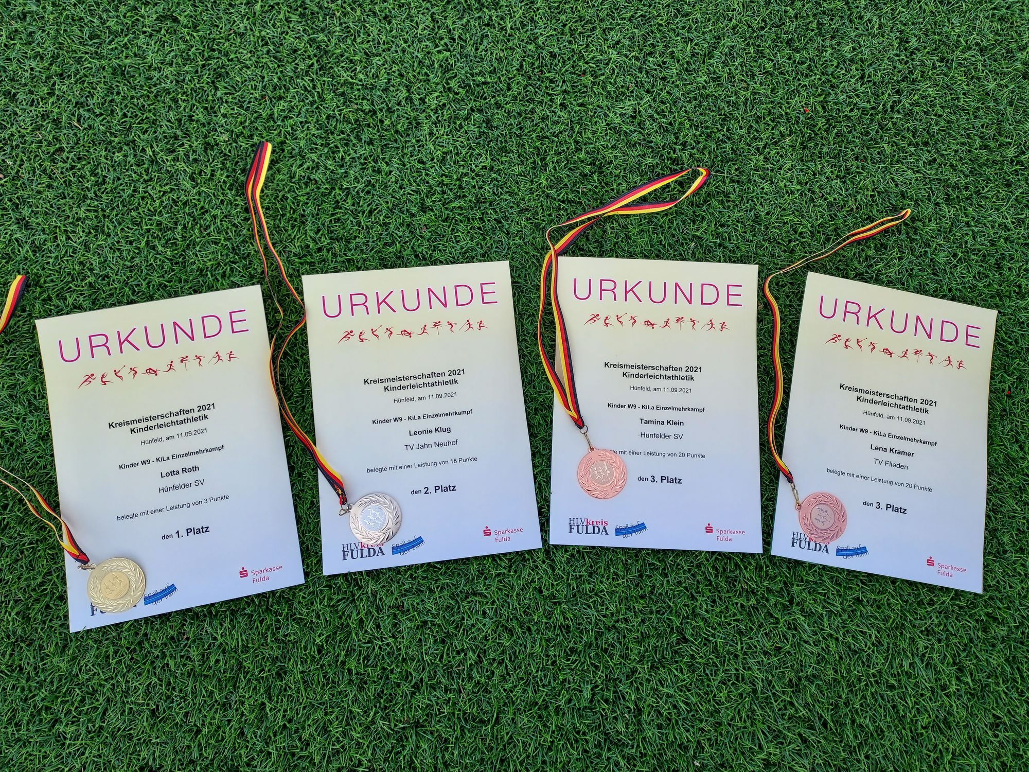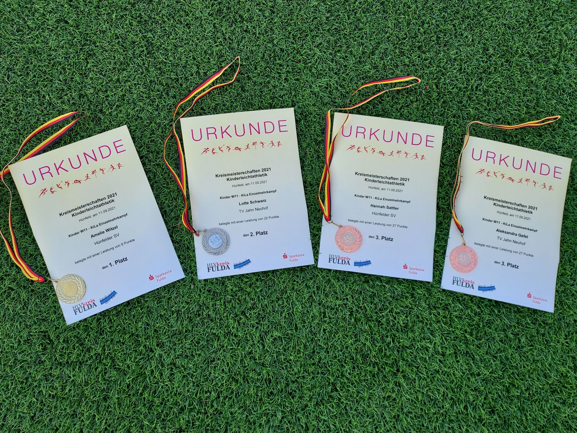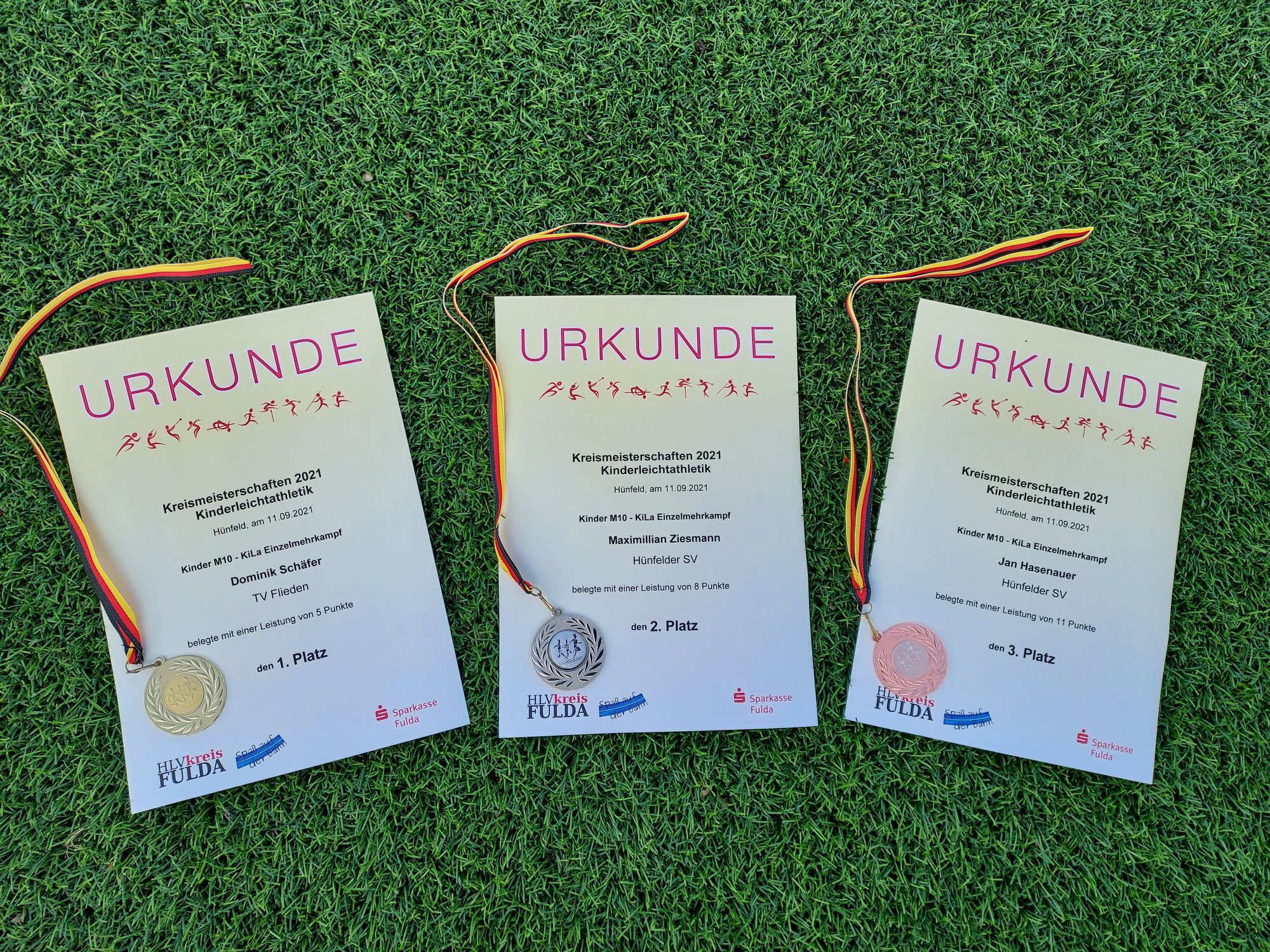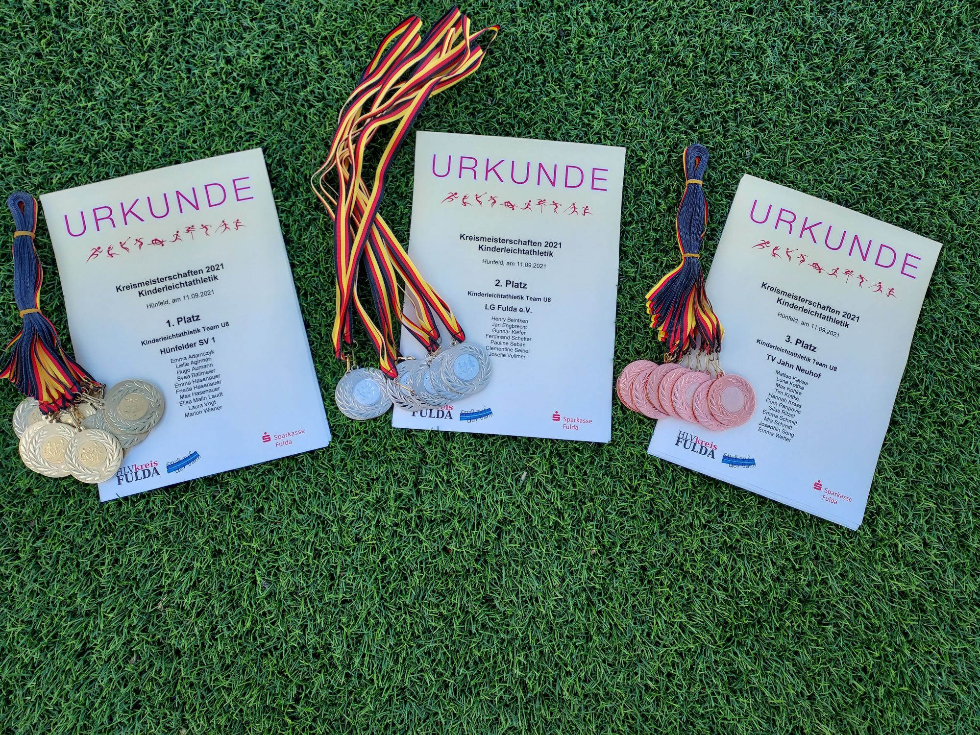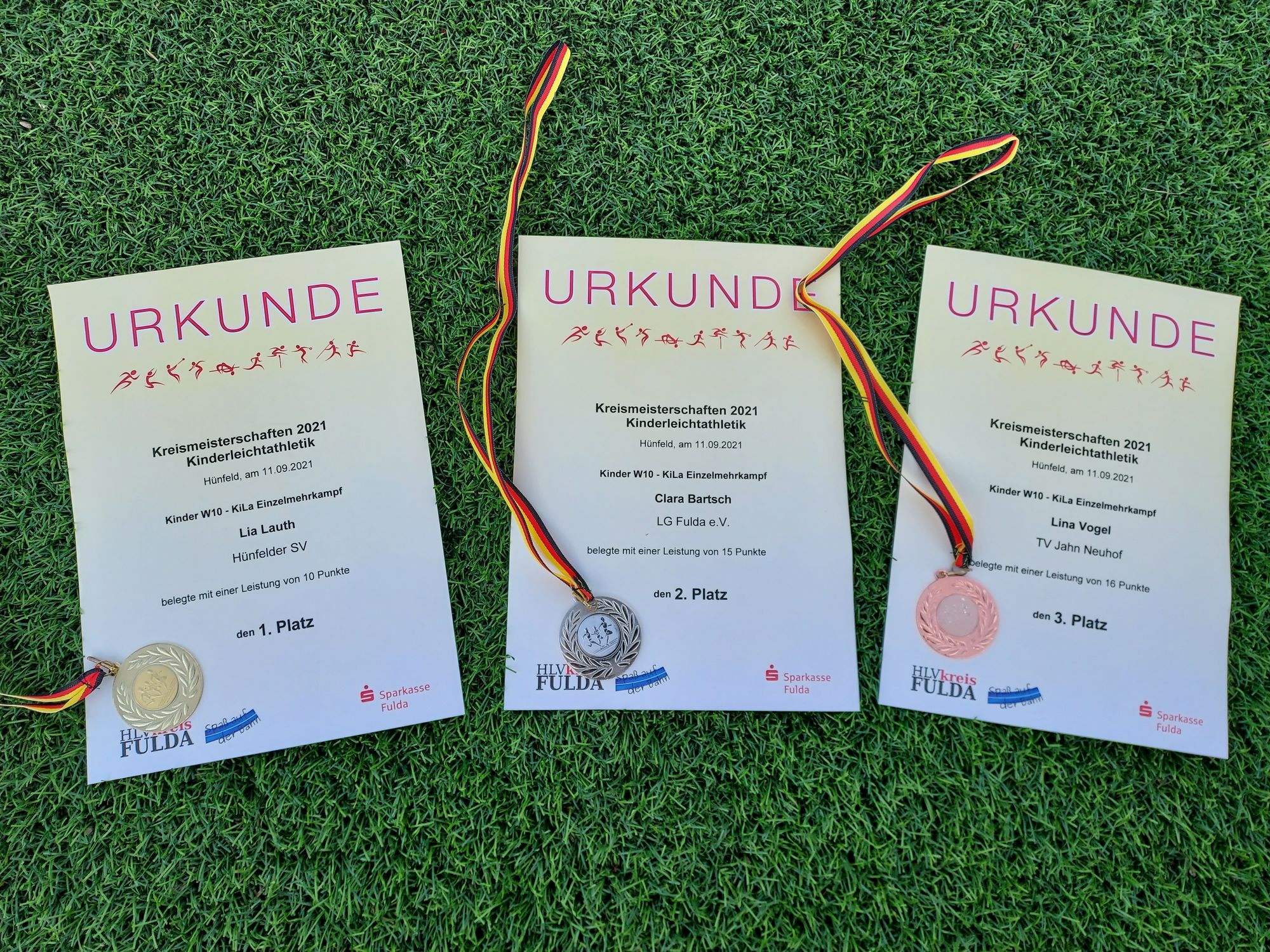 In der Teamwertung holte der Hünfelder SV 3 x GOLD. In der Einzelmehrkampfwertung erreichten die Hünfelder drei Kreismeistertitel: Amelie Witzel (W11), Lia Laudt (W10) und Lotta Roth (W9) hatten in ihren Altersklassen die Nase vorn. Für den TV Petersberg holten Lotta Atzert (W8) und Stian Rübsamen (M8) Goldmedaillen. In der M9 holte Philip Mahr vom TV Neuhof den Titel, in der M10 Dominik Schäfer vom TV Flieden. Gold für die LG Fulda sicherte sich Emil Kaase in der M11.