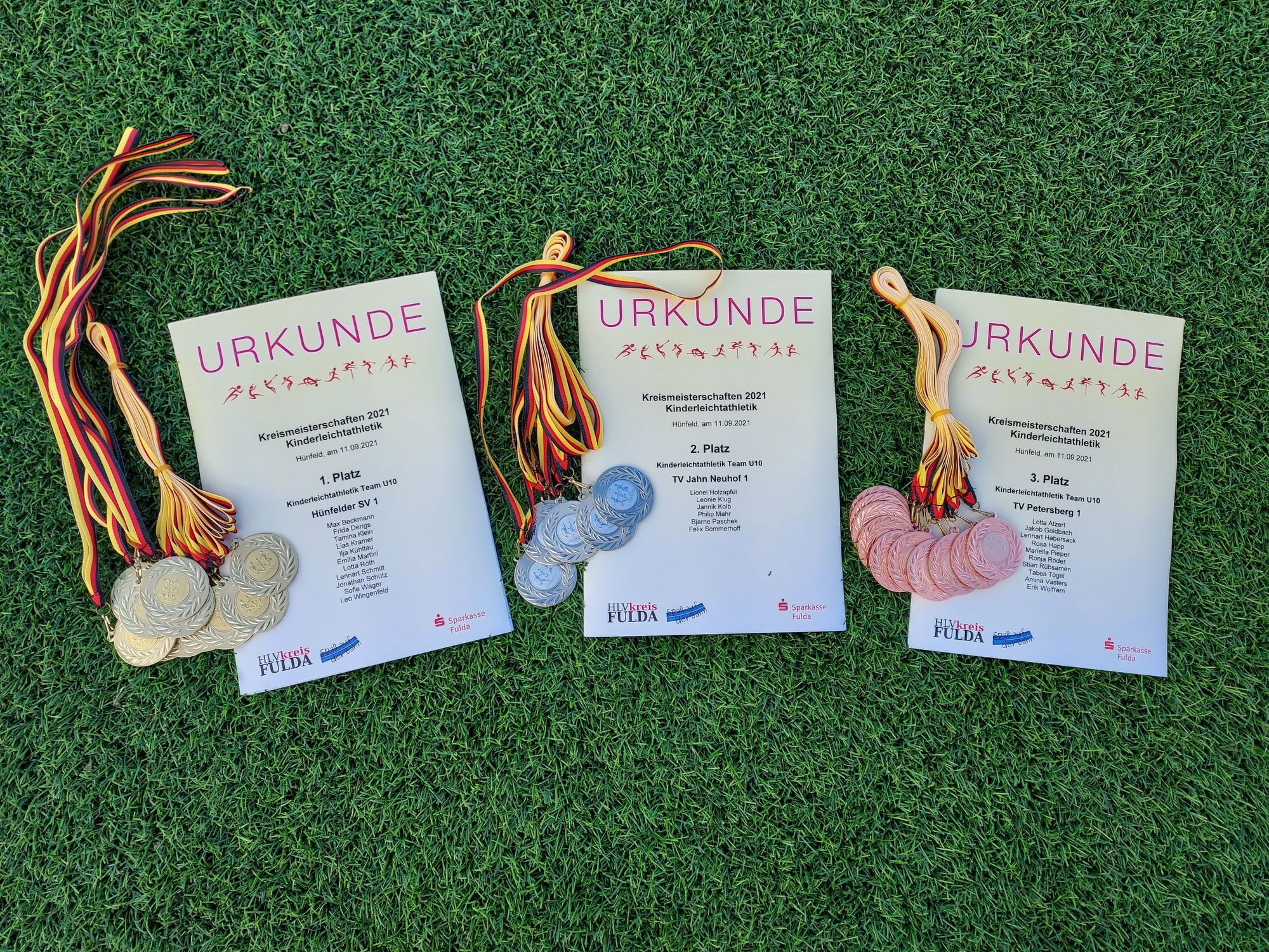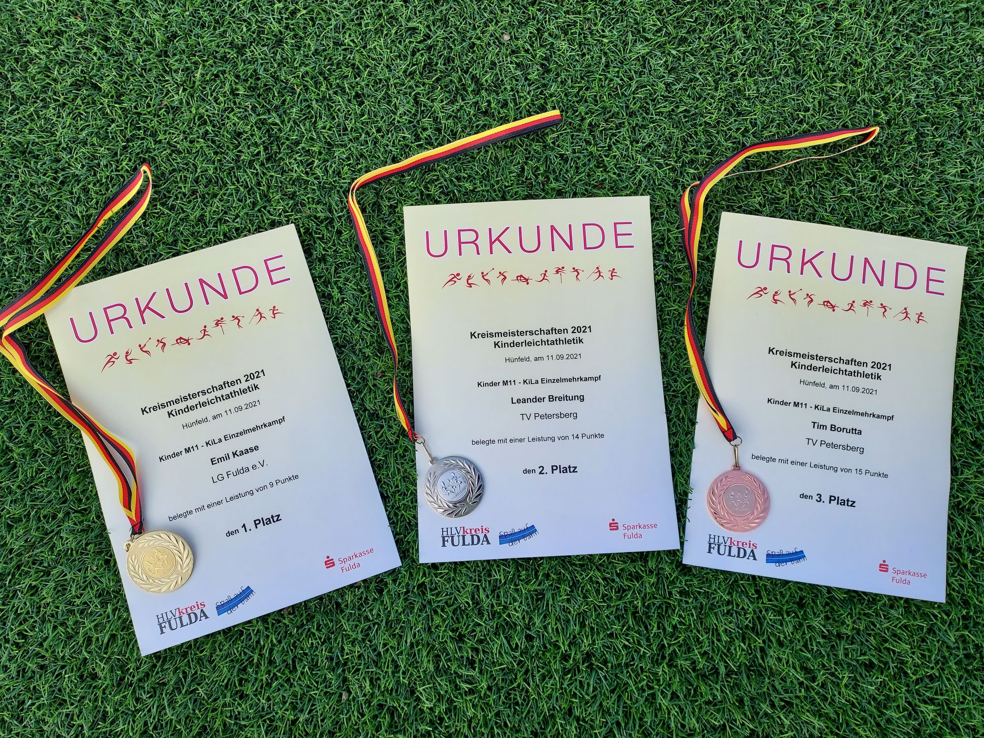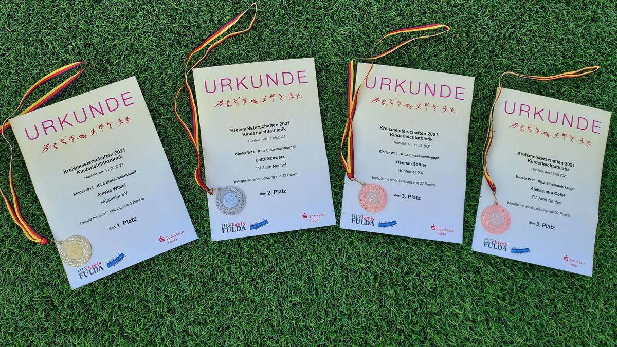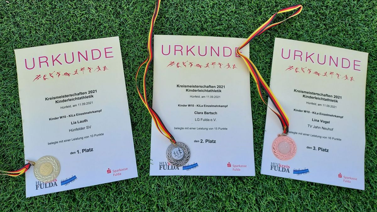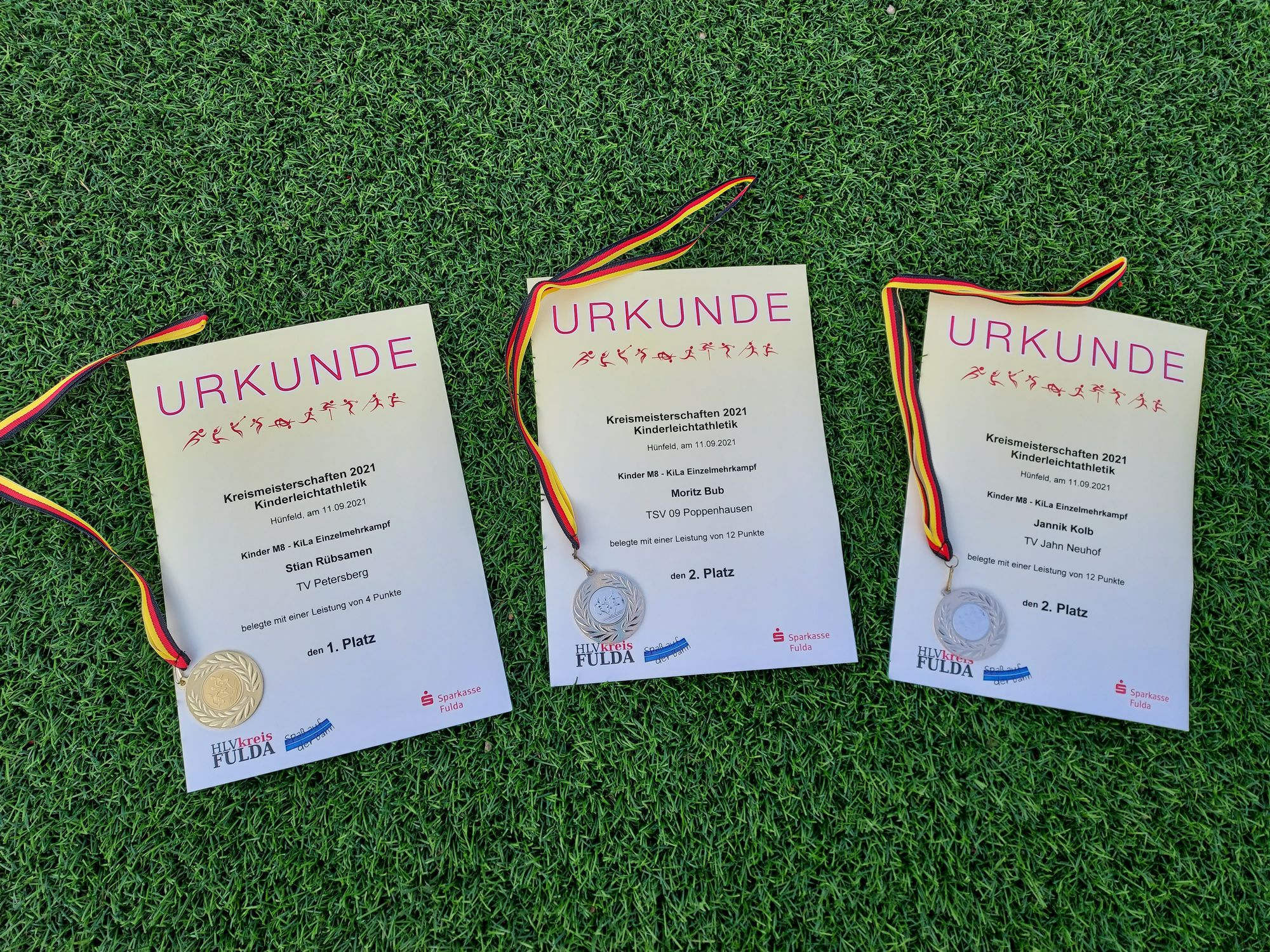 In der Teamwertung holte der Hünfelder SV 3 x GOLD. In der Einzelmehrkampfwertung erreichten die Hünfelder drei Kreismeistertitel: Amelie Witzel (W11), Lia Laudt (W10) und Lotta Roth (W9) hatten in ihren Altersklassen die Nase vorn. Für den TV Petersberg holten Lotta Atzert (W8) und Stian Rübsamen (M8) Goldmedaillen. In der M9 holte Philip Mahr vom TV Neuhof den Titel, in der M10 Dominik Schäfer vom TV Flieden. Gold für die LG Fulda sicherte sich Emil Kaase in der M11.