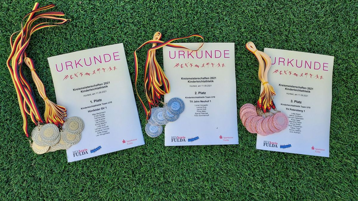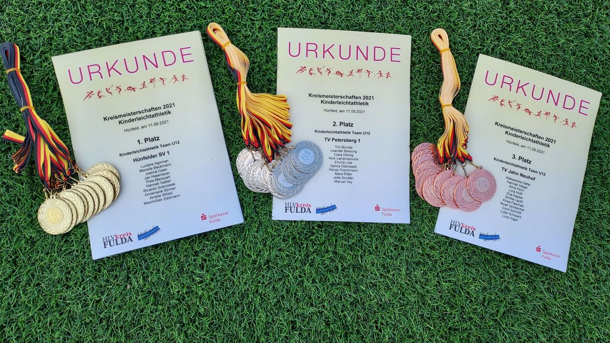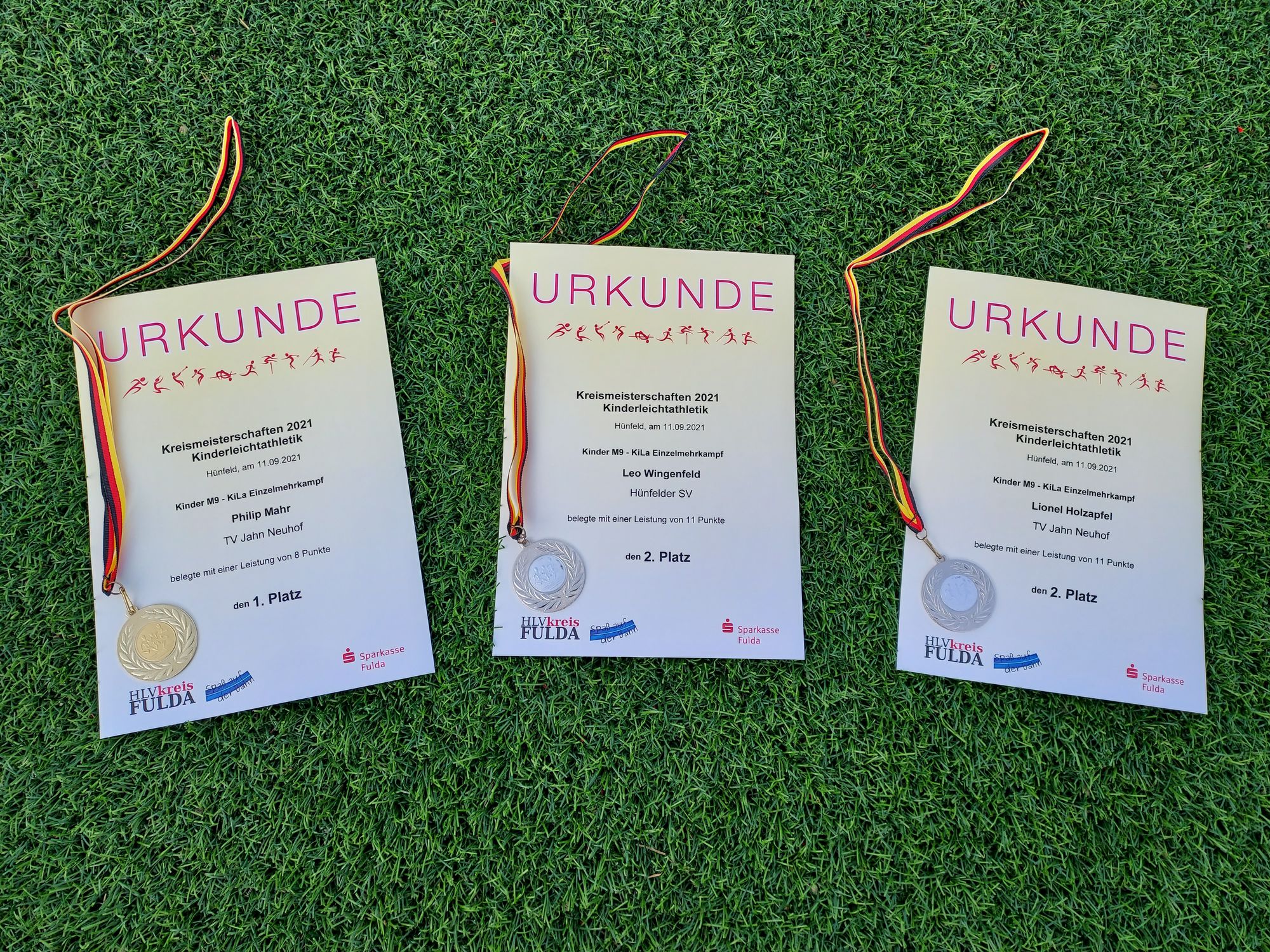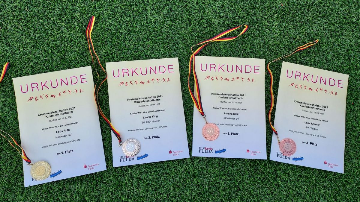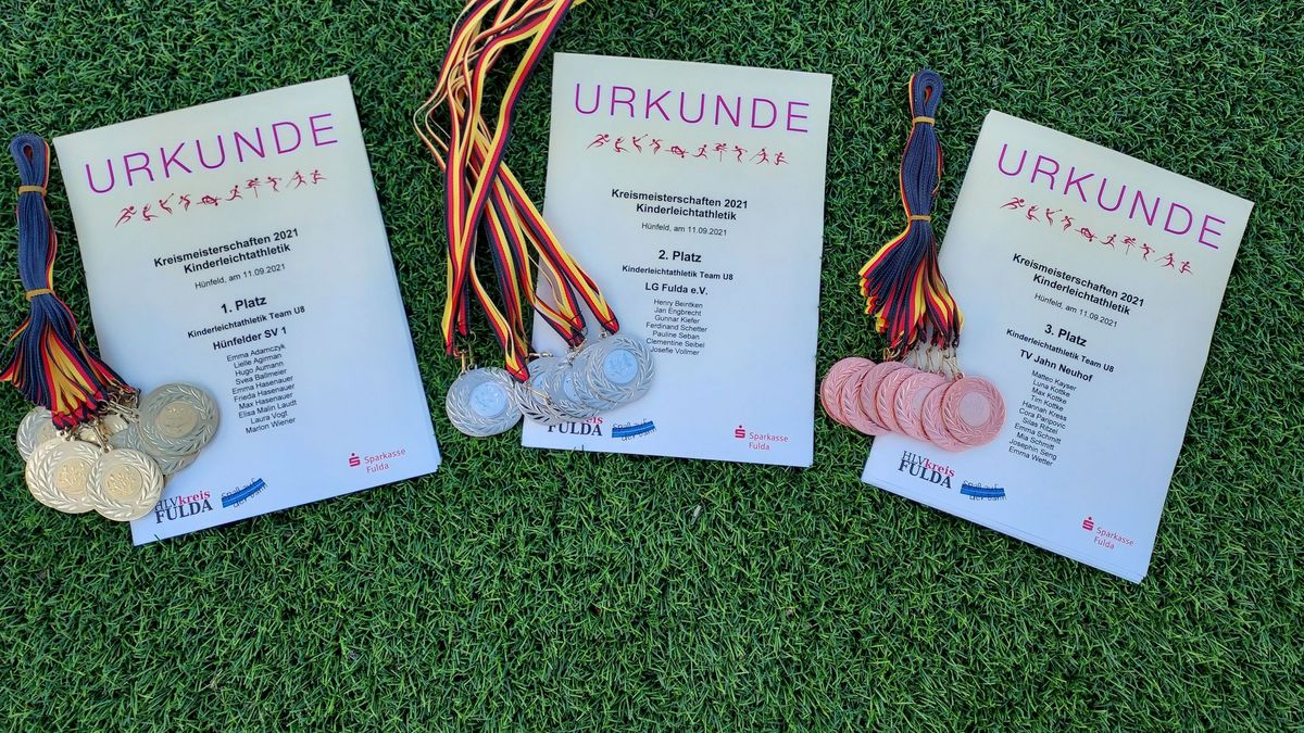 In der Teamwertung holte der Hünfelder SV 3 x GOLD. In der Einzelmehrkampfwertung erreichten die Hünfelder drei Kreismeistertitel: Amelie Witzel (W11), Lia Laudt (W10) und Lotta Roth (W9) hatten in ihren Altersklassen die Nase vorn. Für den TV Petersberg holten Lotta Atzert (W8) und Stian Rübsamen (M8) Goldmedaillen. In der M9 holte Philip Mahr vom TV Neuhof den Titel, in der M10 Dominik Schäfer vom TV Flieden. Gold für die LG Fulda sicherte sich Emil Kaase in der M11.