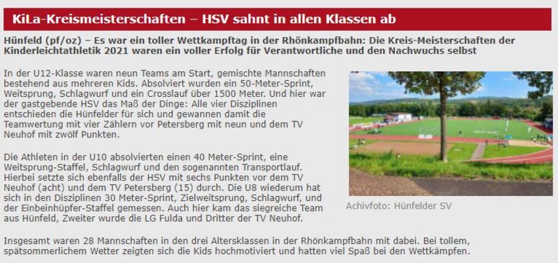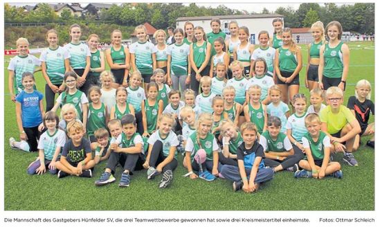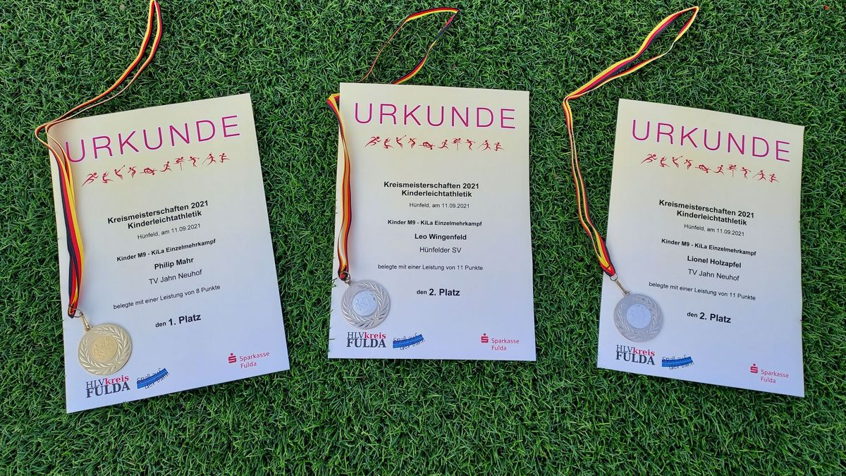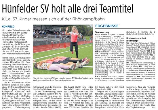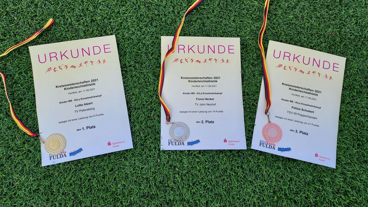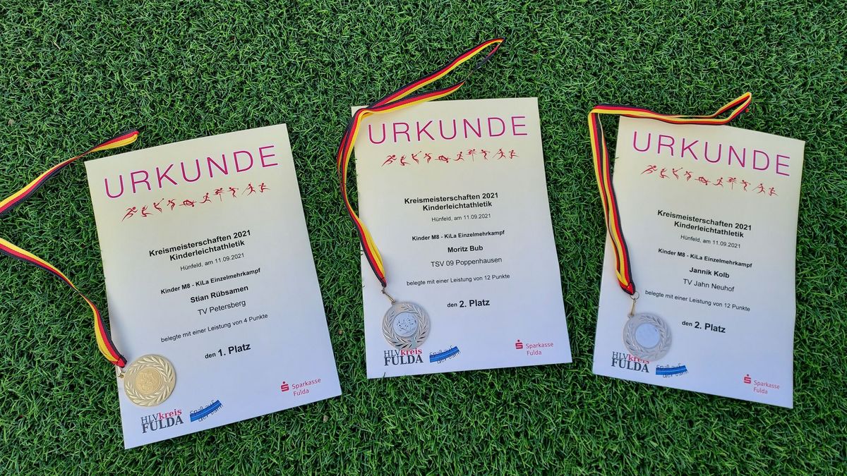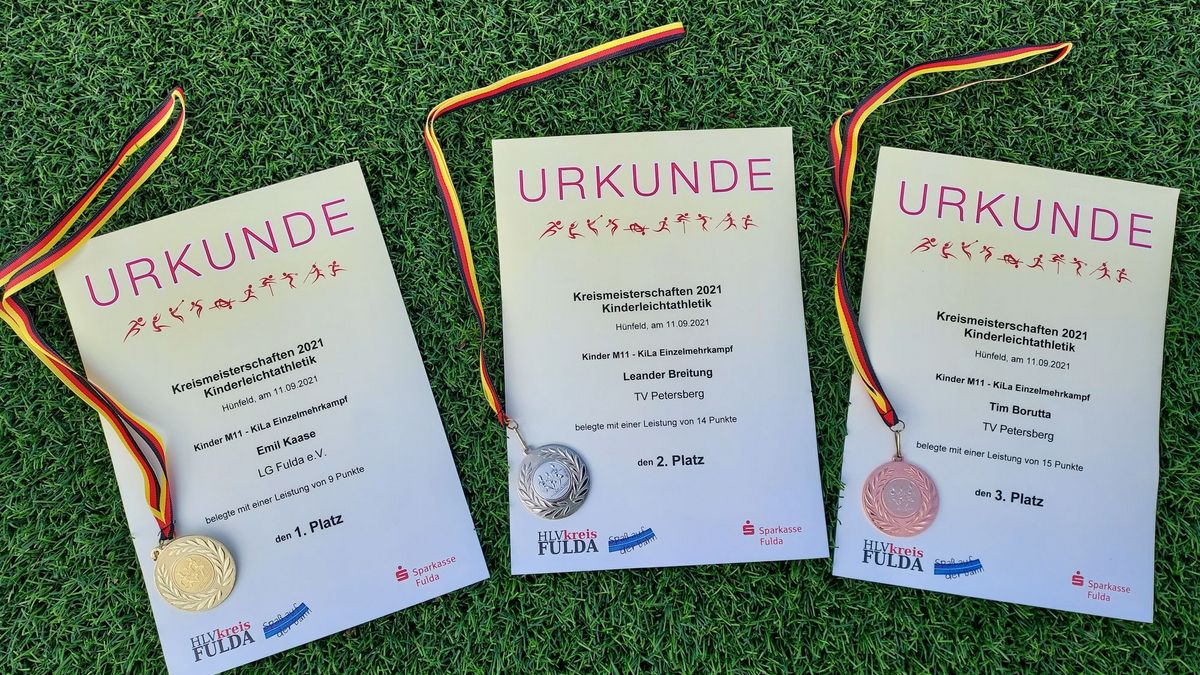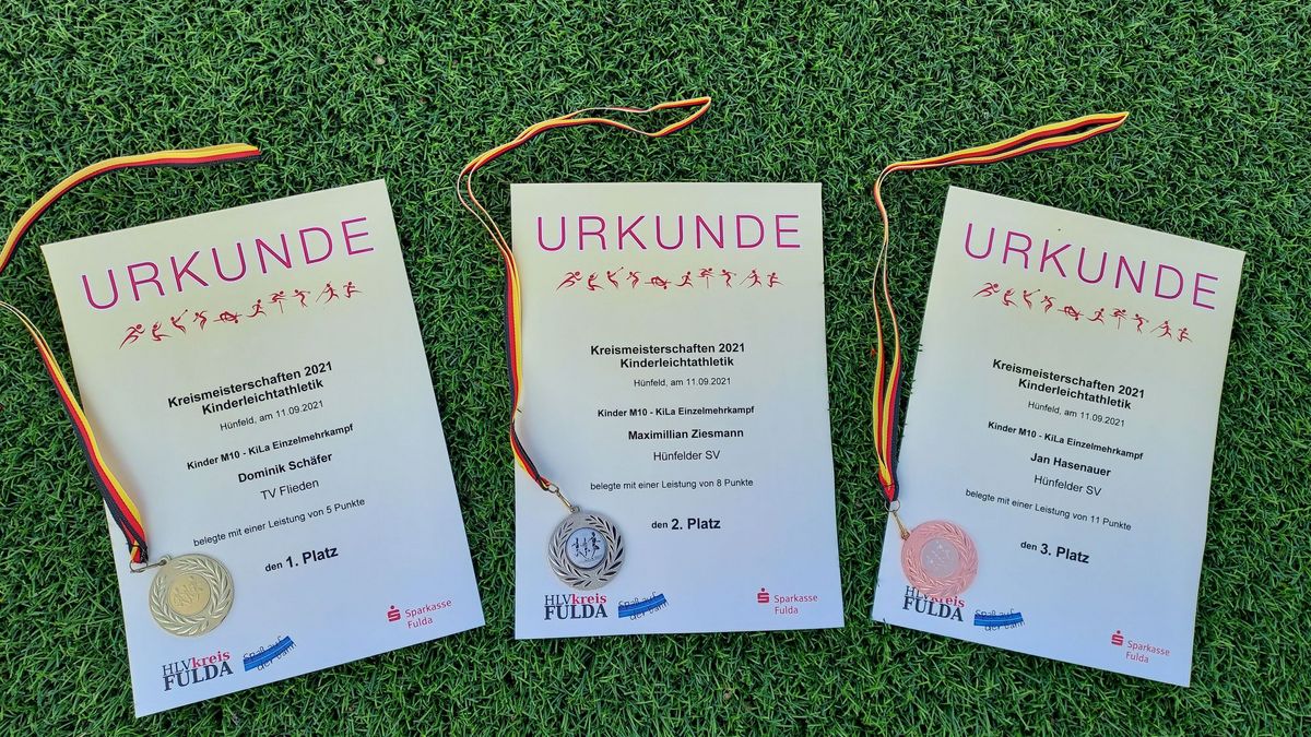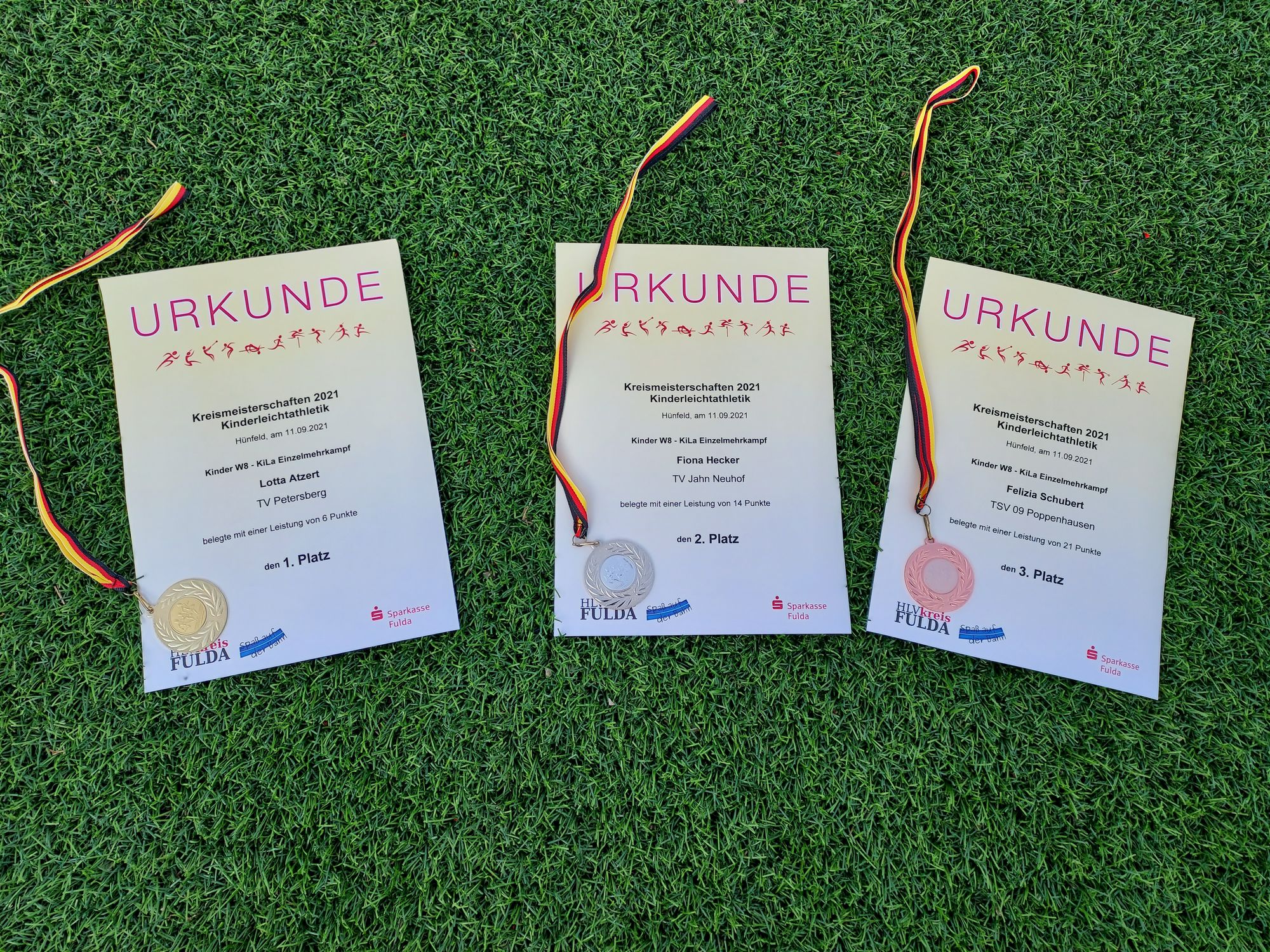 In der Teamwertung holte der Hünfelder SV 3 x GOLD. In der Einzelmehrkampfwertung erreichten die Hünfelder drei Kreismeistertitel: Amelie Witzel (W11), Lia Laudt (W10) und Lotta Roth (W9) hatten in ihren Altersklassen die Nase vorn. Für den TV Petersberg holten Lotta Atzert (W8) und Stian Rübsamen (M8) Goldmedaillen. In der M9 holte Philip Mahr vom TV Neuhof den Titel, in der M10 Dominik Schäfer vom TV Flieden. Gold für die LG Fulda sicherte sich Emil Kaase in der M11.