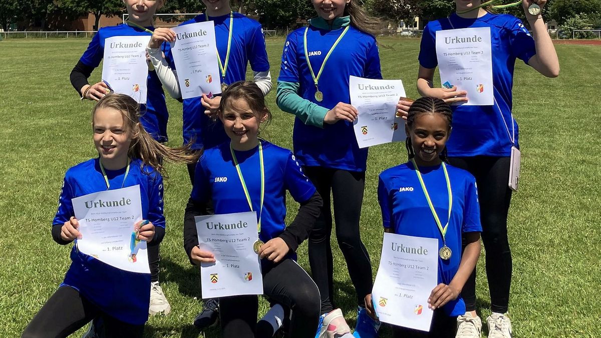 Unser Bild die siegreichen Mädchen der Homberger Turnerschaft mit hinten (von links) Lene-Carlotte Stuhlmann, Laura Skirde, Alisa Sileikaite und Lilli Meichsner sowie vorn (von links) Malene Vogel, Lina Wagner und Efrata Tesfay Genene. (zct)